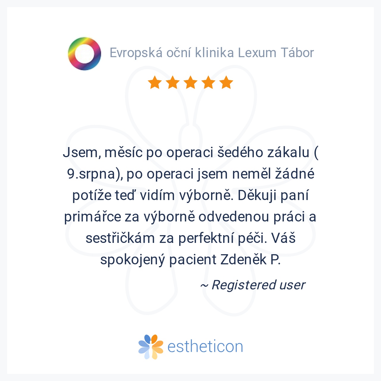 Jsem, měsíc po operaci šedého zákalu ( 9.srpna), po operaci jsem neměl žádné potíže teď vidím výborně. Děkuji paní primářce za výborně odvedenou práci a sestřičkám za perfektní péči. Váš spokojený pacient Zdeněk P.