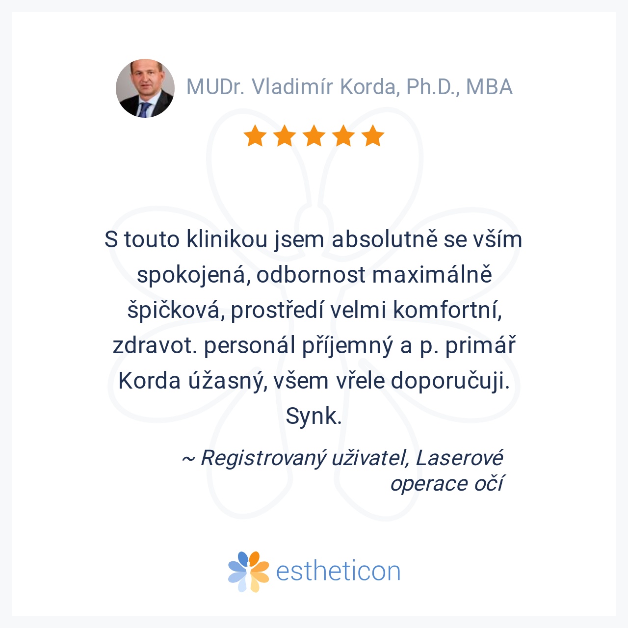 S touto klinikou jsem absolutně se vším spokojená, odbornost maximálně špičková, prostředí velmi komfortní, zdravot. personál příjemný a p. primář Korda úžasný, všem vřele doporučuji.