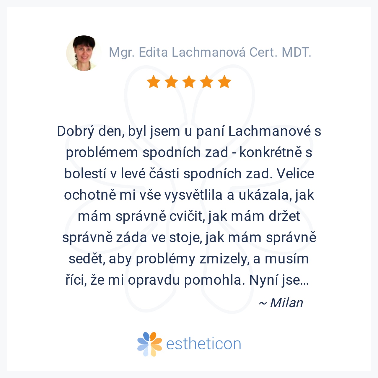 Dobrý den, byl jsem u paní Lachmanové s problémem spodních zad - konkrétně s bolestí v levé části spodních zad. Velice ochotně mi vše vysvětlila a ukázala, jak mám správně cvičit, jak mám držet správně záda ve stoje, jak... Více