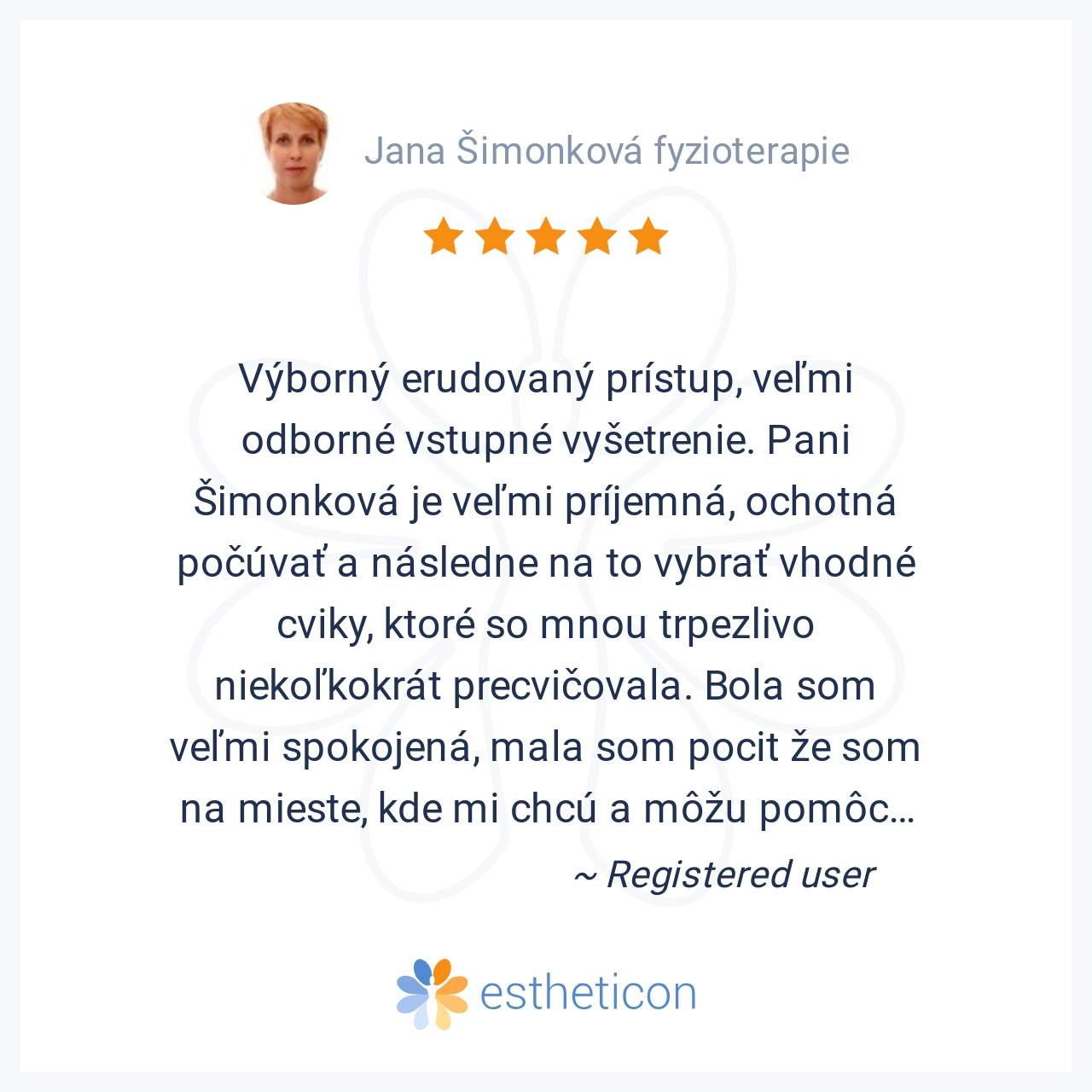 Výborný erudovaný prístup, veľmi odborné vstupné vyšetrenie. Pani Šimonková je veľmi príjemná, ochotná počúvať a následne na to vybrať vhodné cviky, ktoré so mnou trpezlivo niekoľkokrát precvičovala. Bola som veľmi spoko... Více