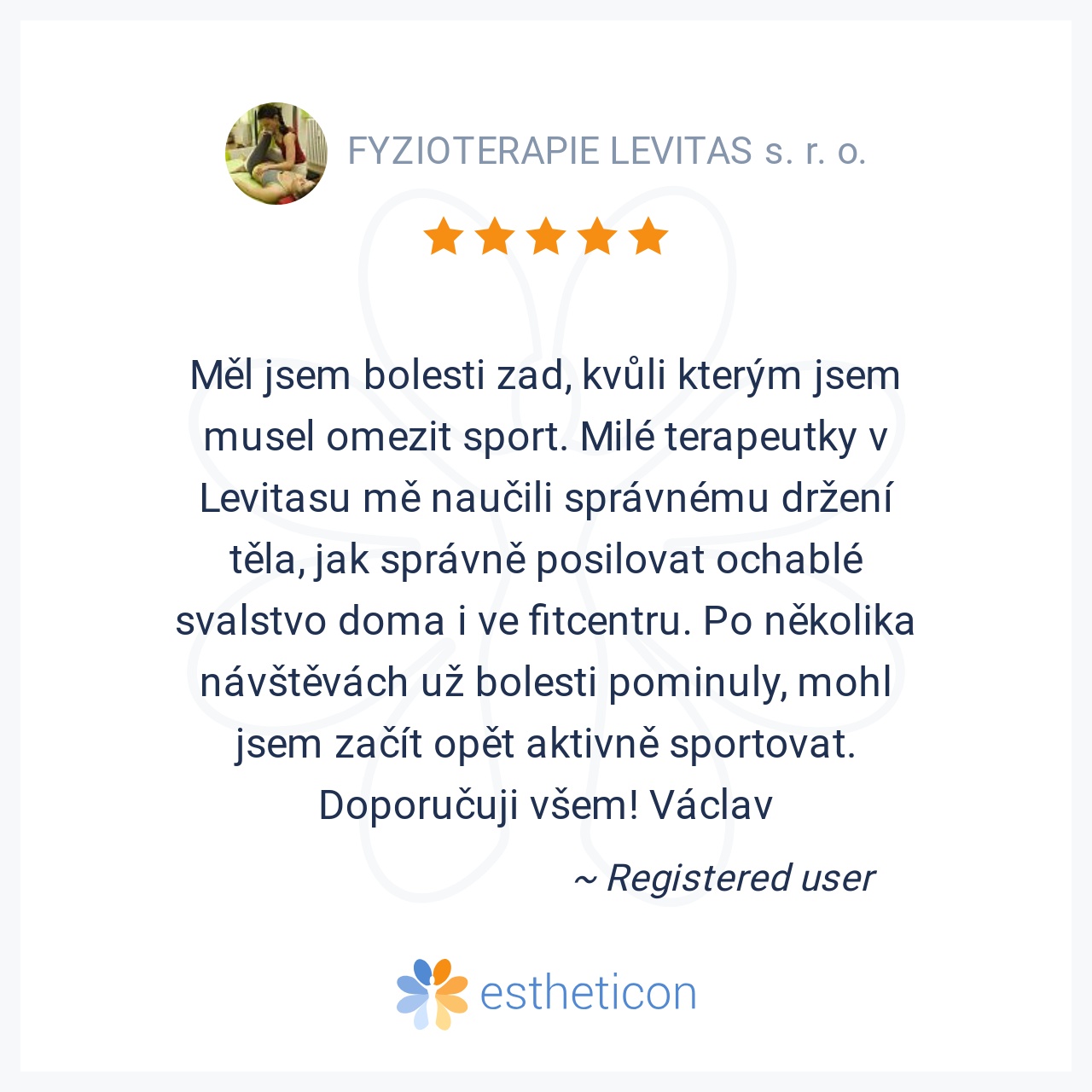 Měl jsem bolesti zad, kvůli kterým jsem musel omezit sport. Milé terapeutky v Levitasu mě naučili správnému držení těla, jak správně posilovat ochablé svalstvo doma i ve fitcentru. Po několika návštěvách už bolesti pomin... Více