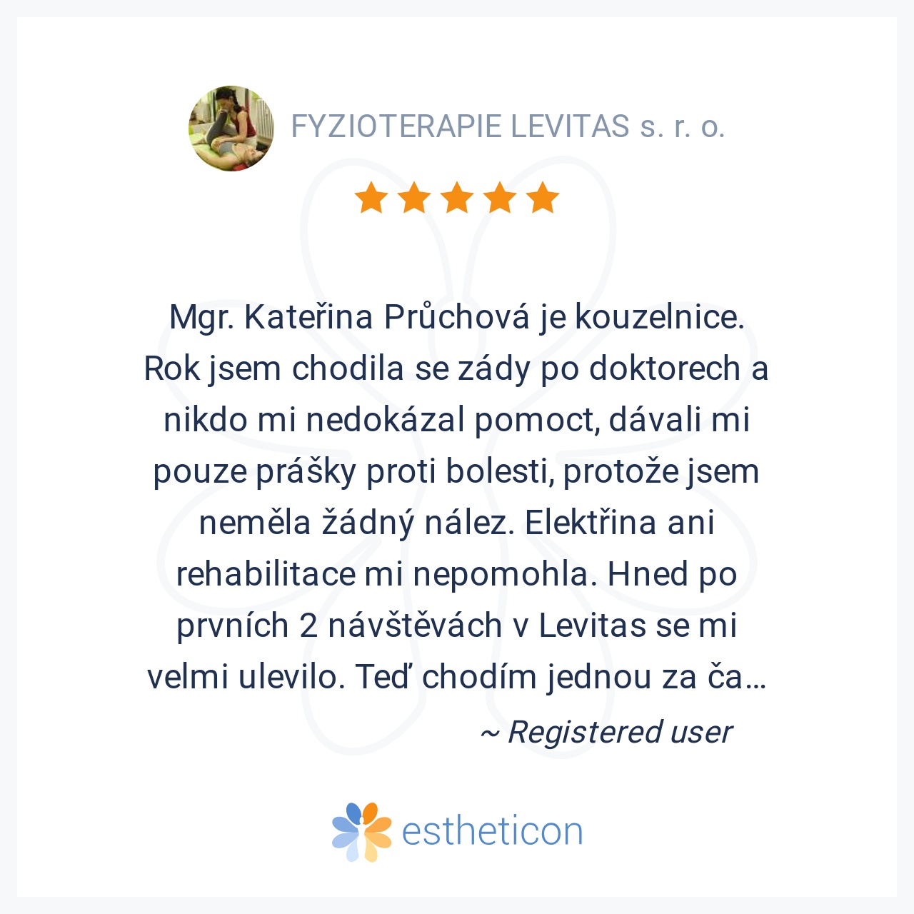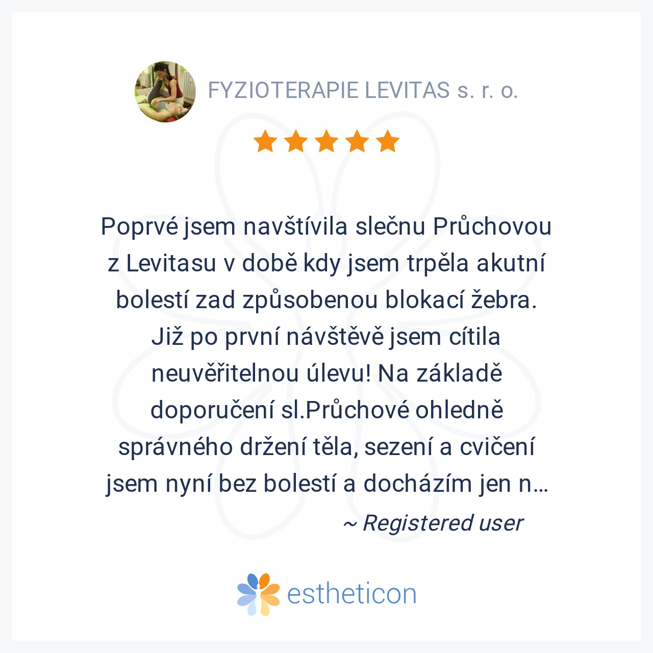 Poprvé jsem navštívila slečnu Průchovou z Levitasu v době kdy jsem trpěla akutní bolestí zad způsobenou blokací žebra. Již po první návštěvě jsem cítila neuvěřitelnou úlevu! Na základě doporučení sl.Průchové ohledně sprá... Více