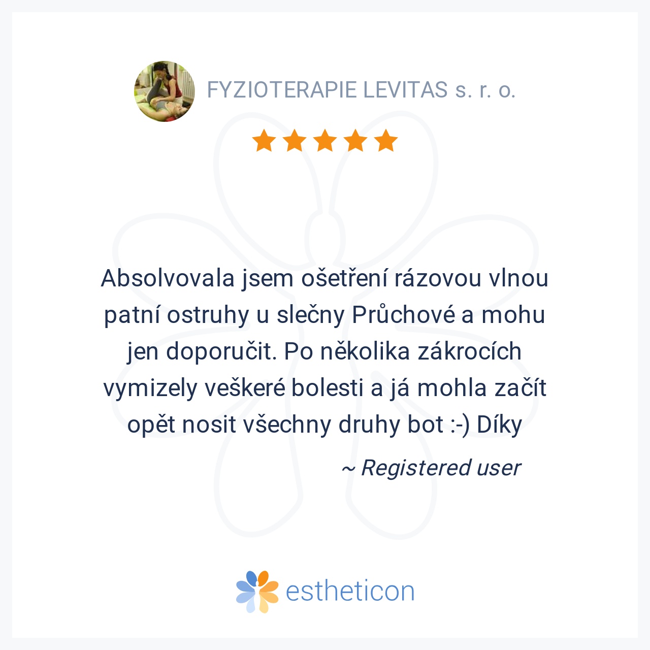 Absolvovala jsem ošetření rázovou vlnou patní ostruhy u slečny Průchové a mohu jen doporučit. Po několika zákrocích vymizely veškeré bolesti a já mohla začít opět nosit všechny druhy bot :-) Díky