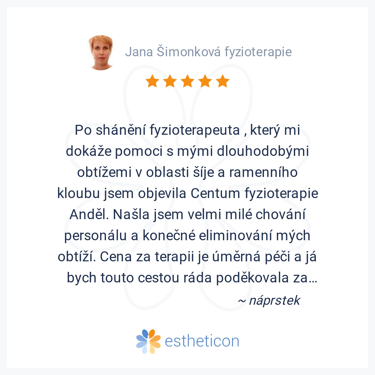Po shánění fyzioterapeuta , který mi dokáže pomoci s mými dlouhodobými obtížemi v oblasti šíje a ramenního kloubu jsem objevila Centum fyzioterapie Anděl. Našla jsem velmi milé chování personálu a konečné eliminování mýc... Více