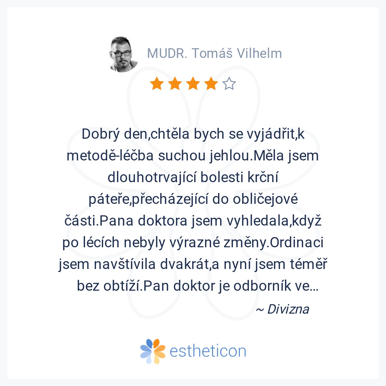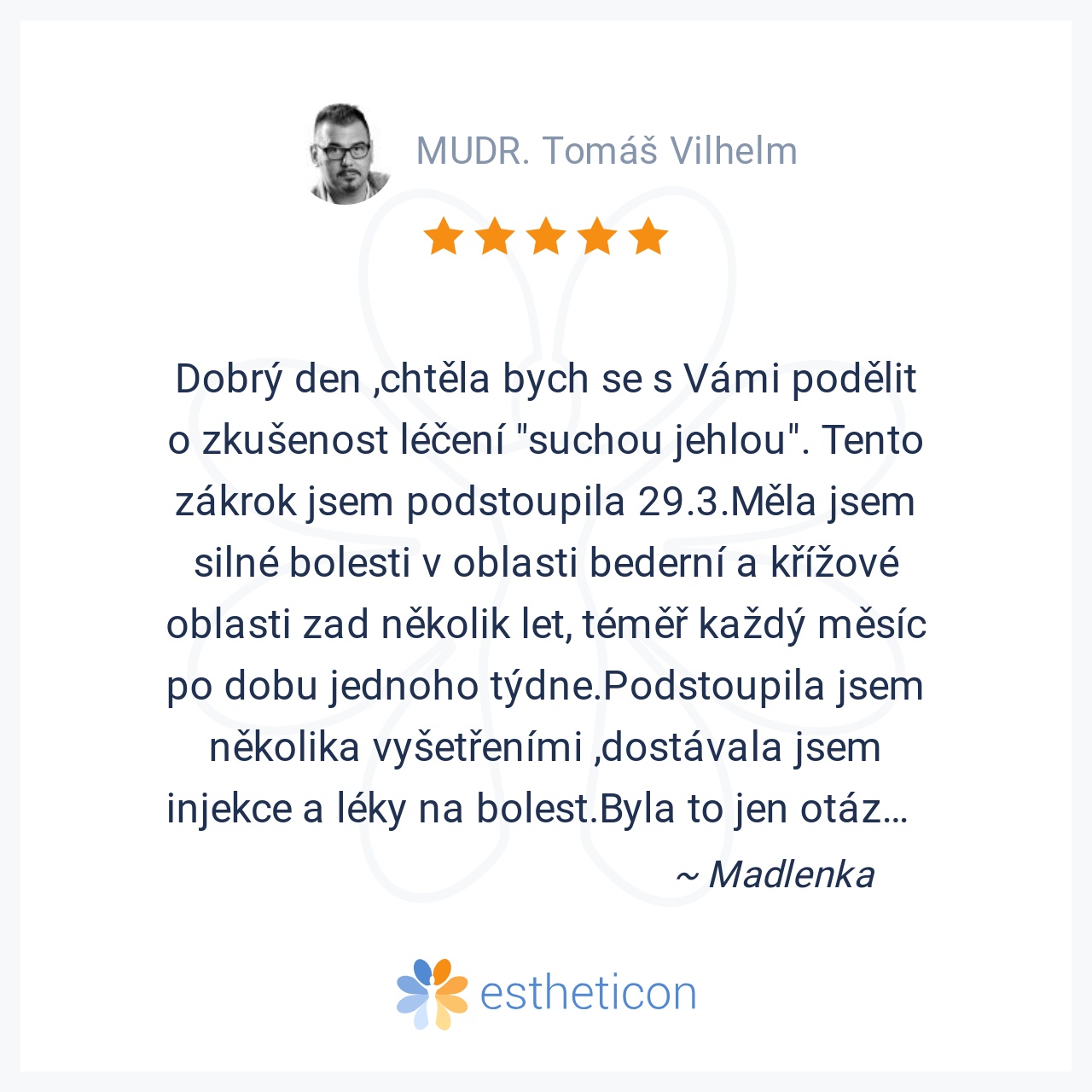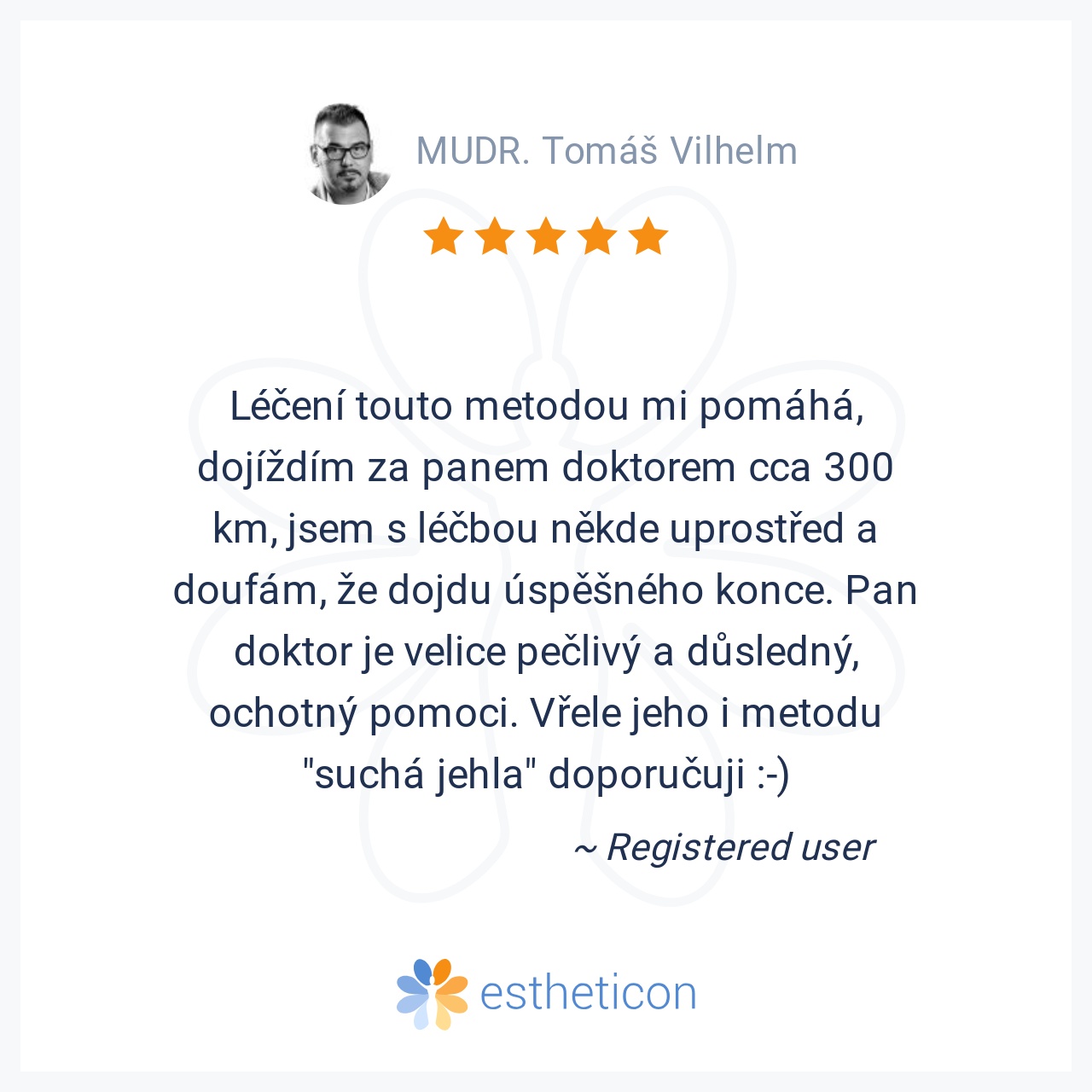 MUDr.Vilhelma považuji nejen za zcela výjimečného lékaře, profesionála,ale především laskavého člověka, kterému věřím. Trpím chronickými bolestmi v oblasti bederní páteře a terapie suchou jehlou je jistota, která mi okam... Více