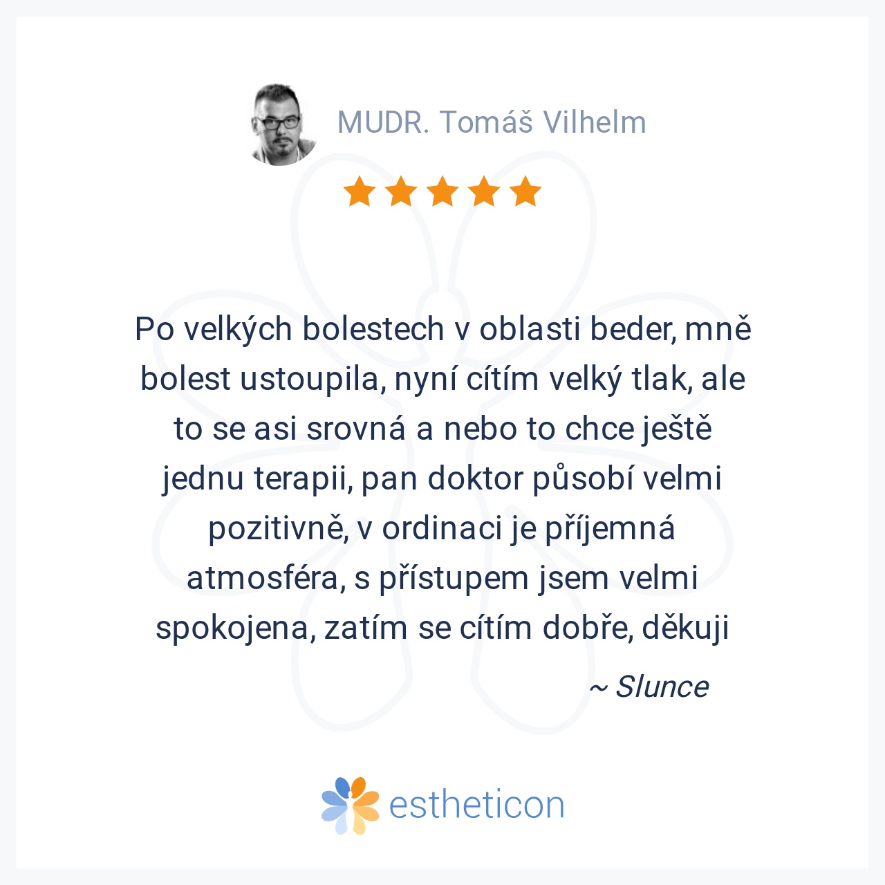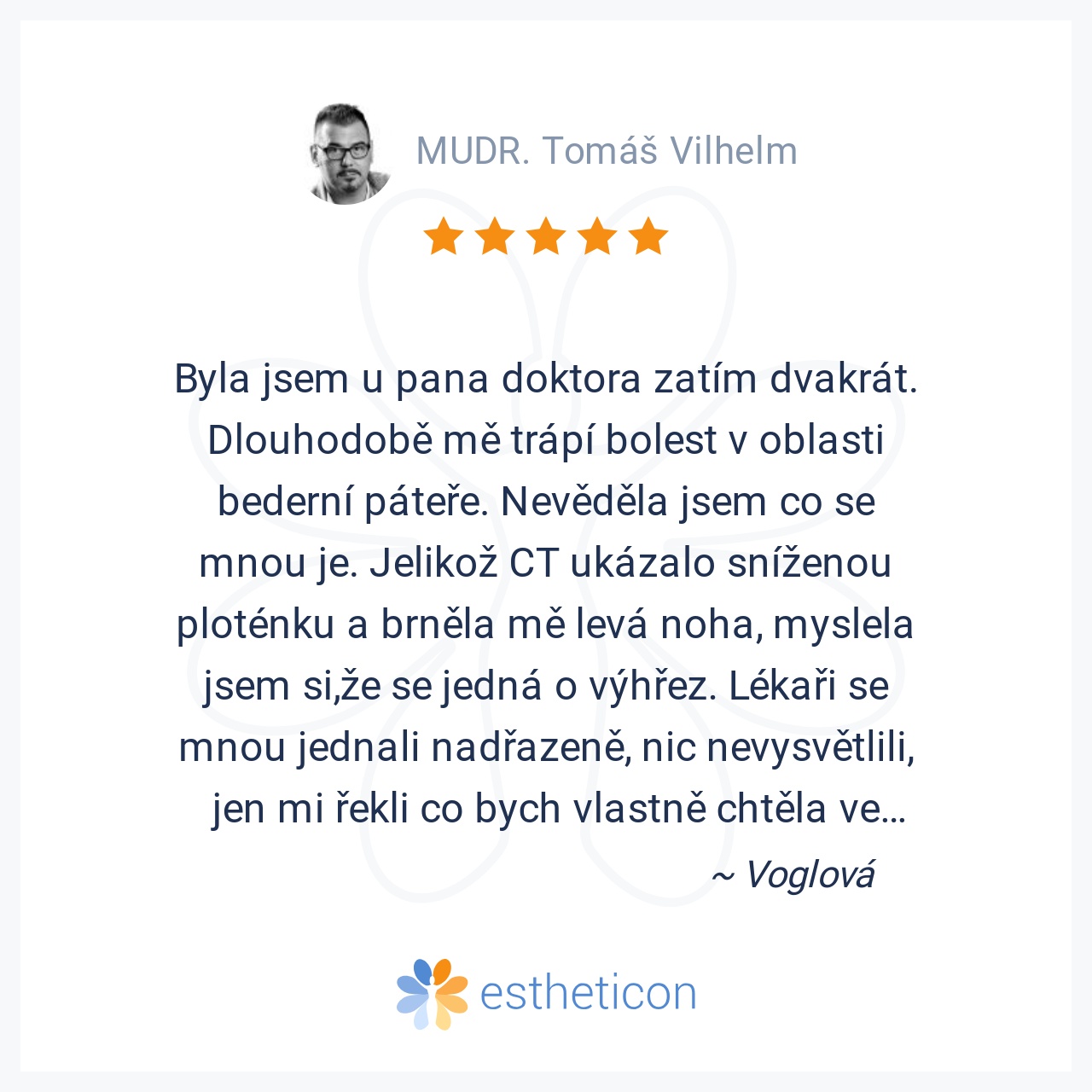 Byla jsem u pana doktora zatím dvakrát. Dlouhodobě mě trápí bolest v oblasti bederní páteře. Nevěděla jsem co se mnou je. Jelikož CT ukázalo sníženou ploténku a brněla mě levá noha, myslela jsem si,že se jedná o výhřez. ... Více