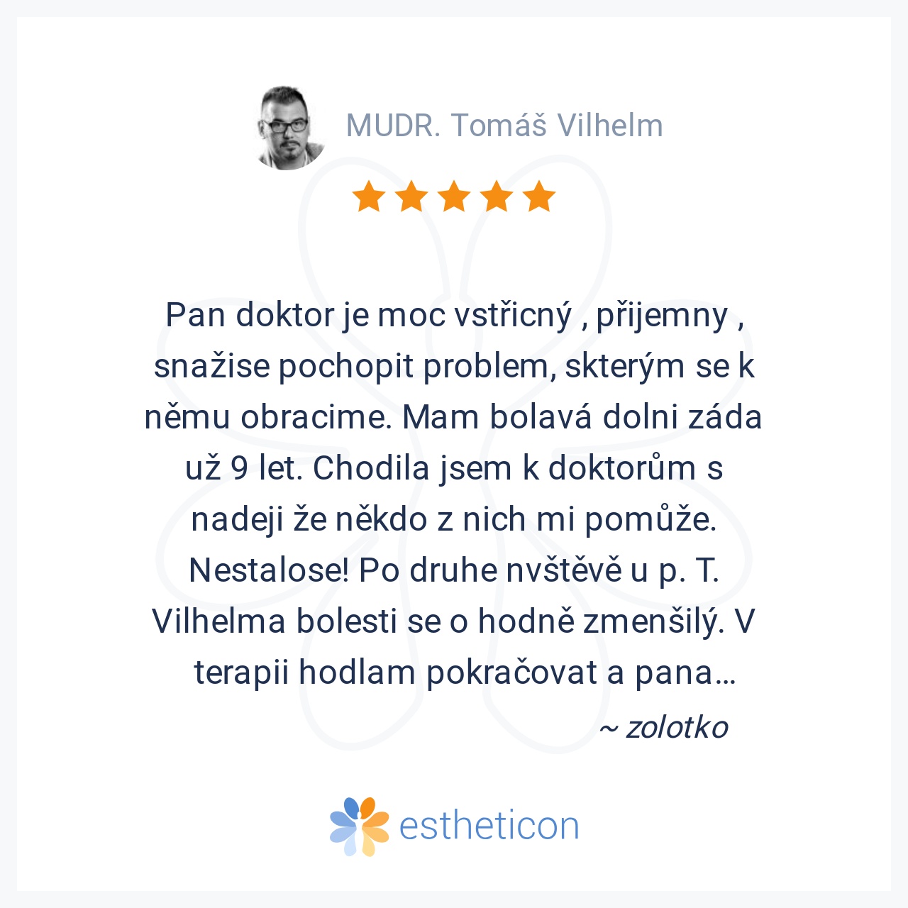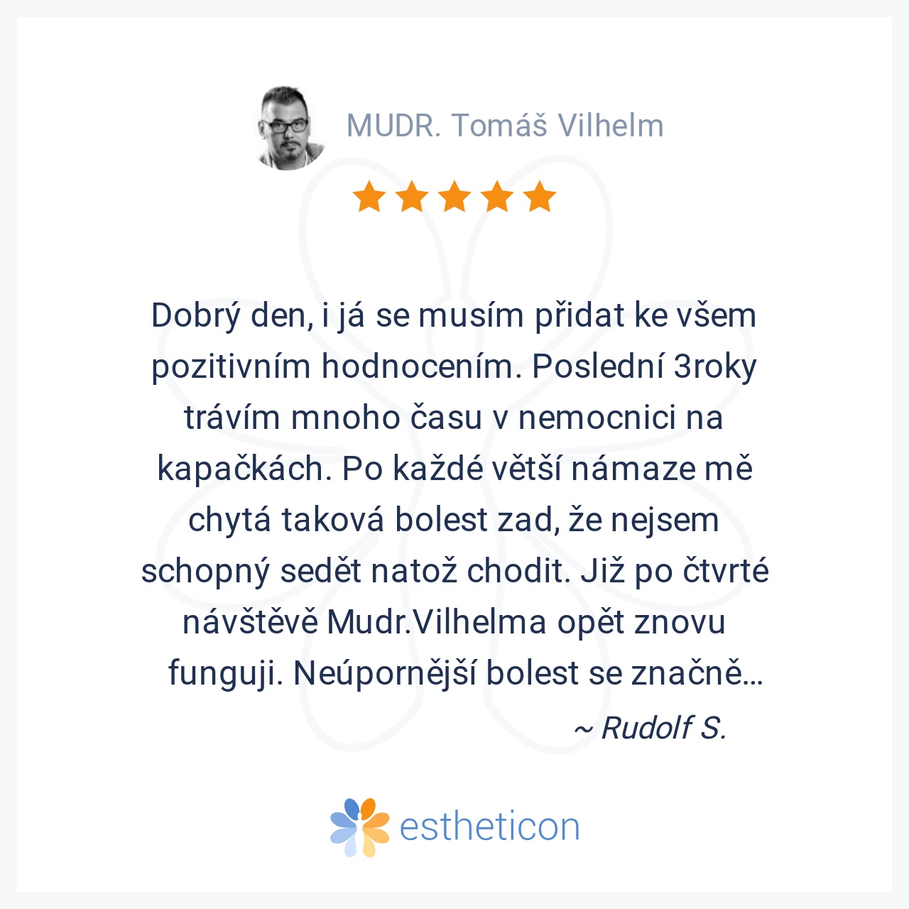 Na základě sedavé a stresující práce u mě došlo k výhřezu krční ploténky a svalovému spasmu na pravém trapézu. Nemohla jsem sedět a dva roky jsem trpěla velkými bolestmi. Díky panu doktoru Wilhelmovi jsem se zbavila nejv... Více