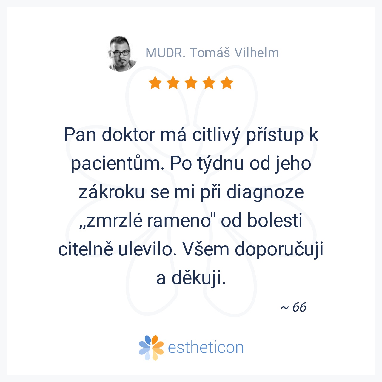 Pan doktor má citlivý přístup k pacientům. Po týdnu od jeho zákroku se mi při diagnoze ,,zmrzlé rameno" od bolesti citelně ulevilo. Všem doporučuji a děkuji.