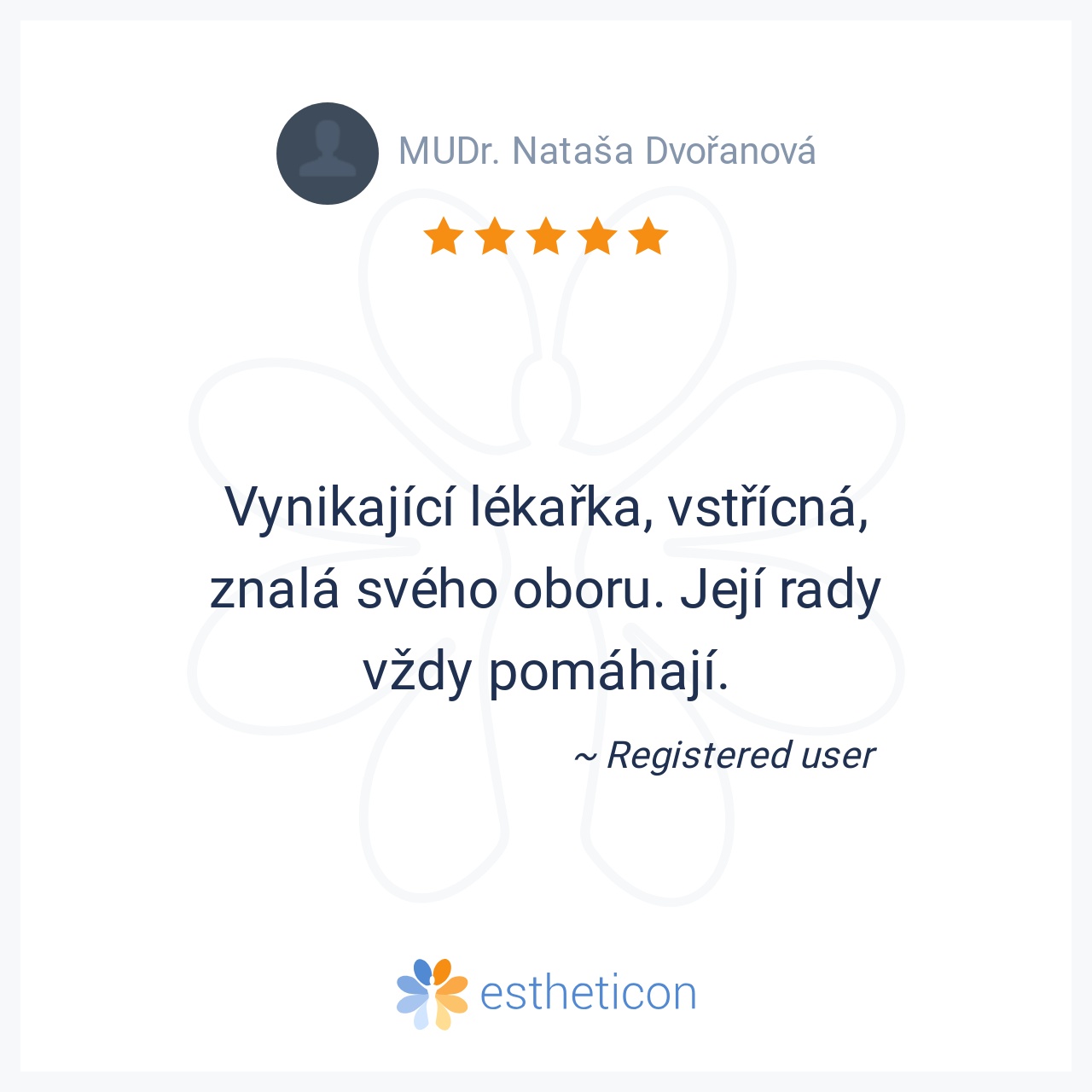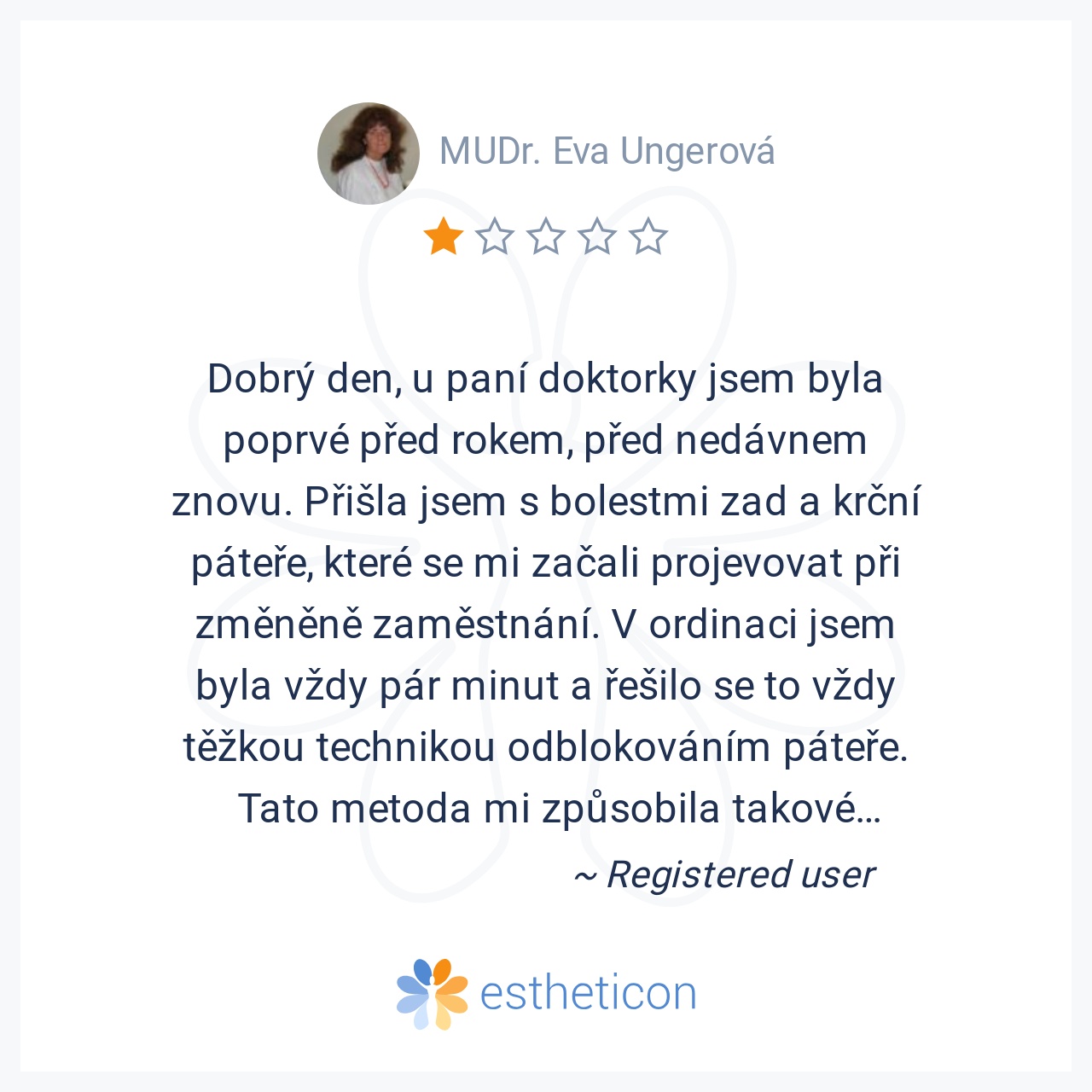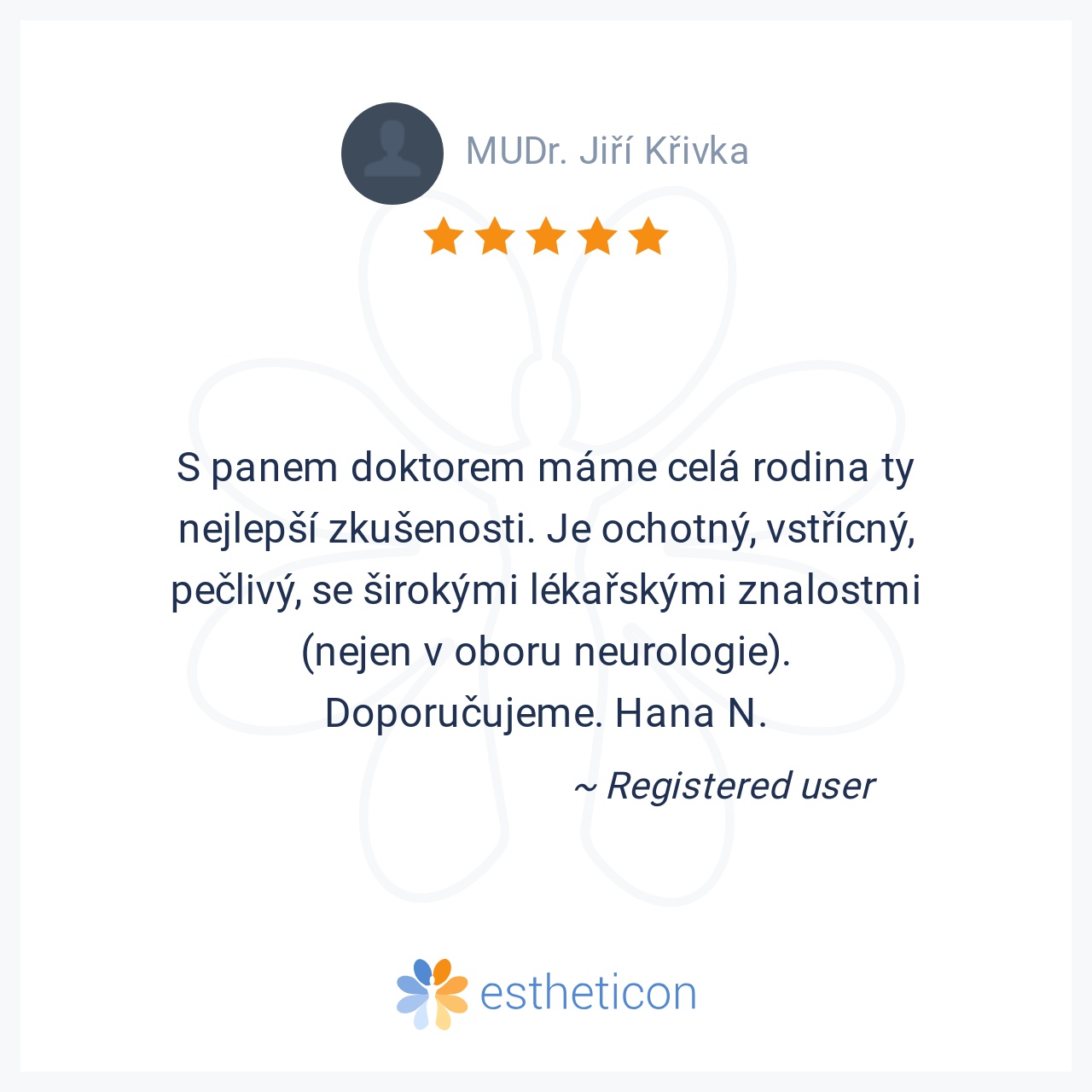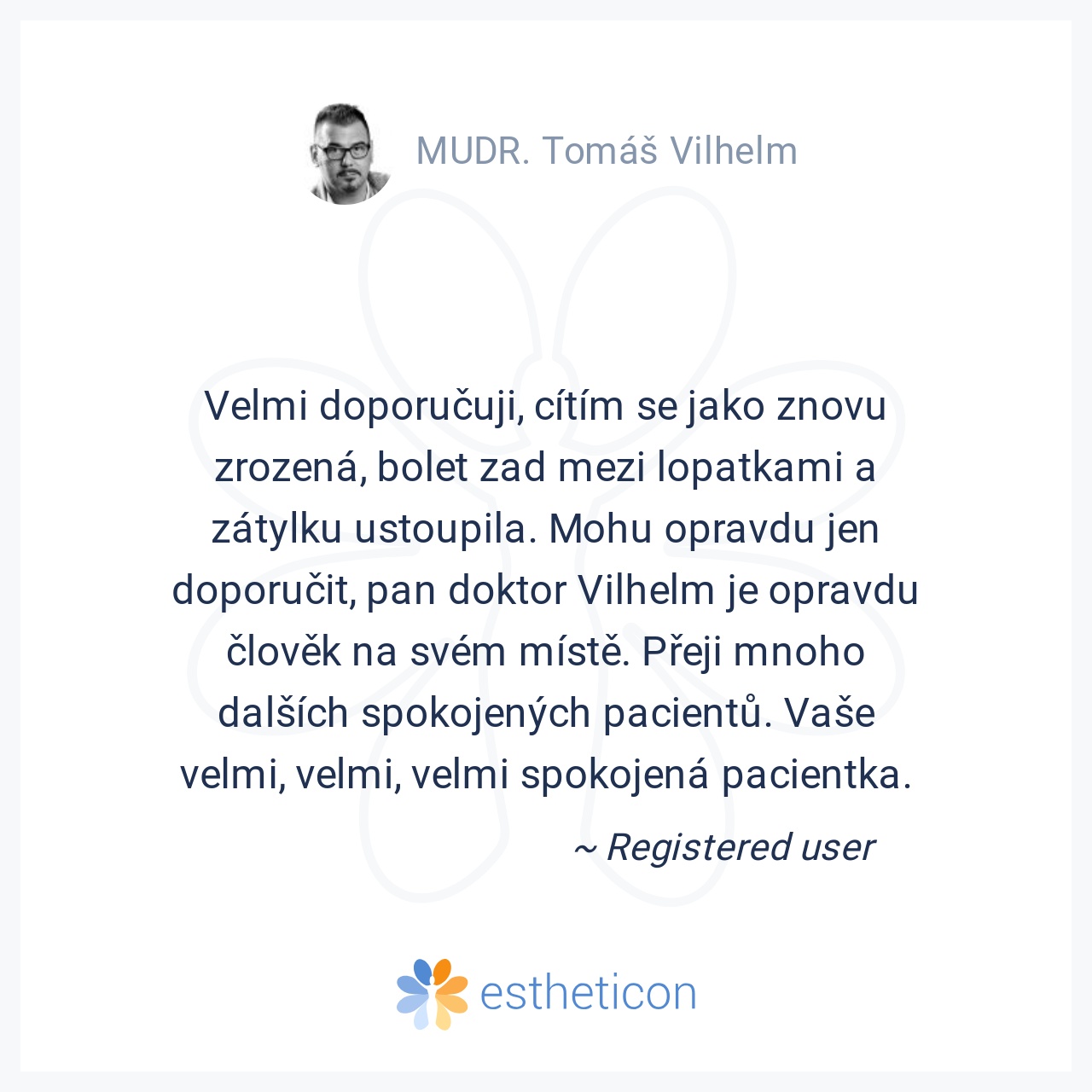 Ocenila jsem velice osobní přístup ke každému pacientu. Stará se nejen o tělesnou schránku, ale i o stránku duševní. Mohu jej upřímně doporučit.