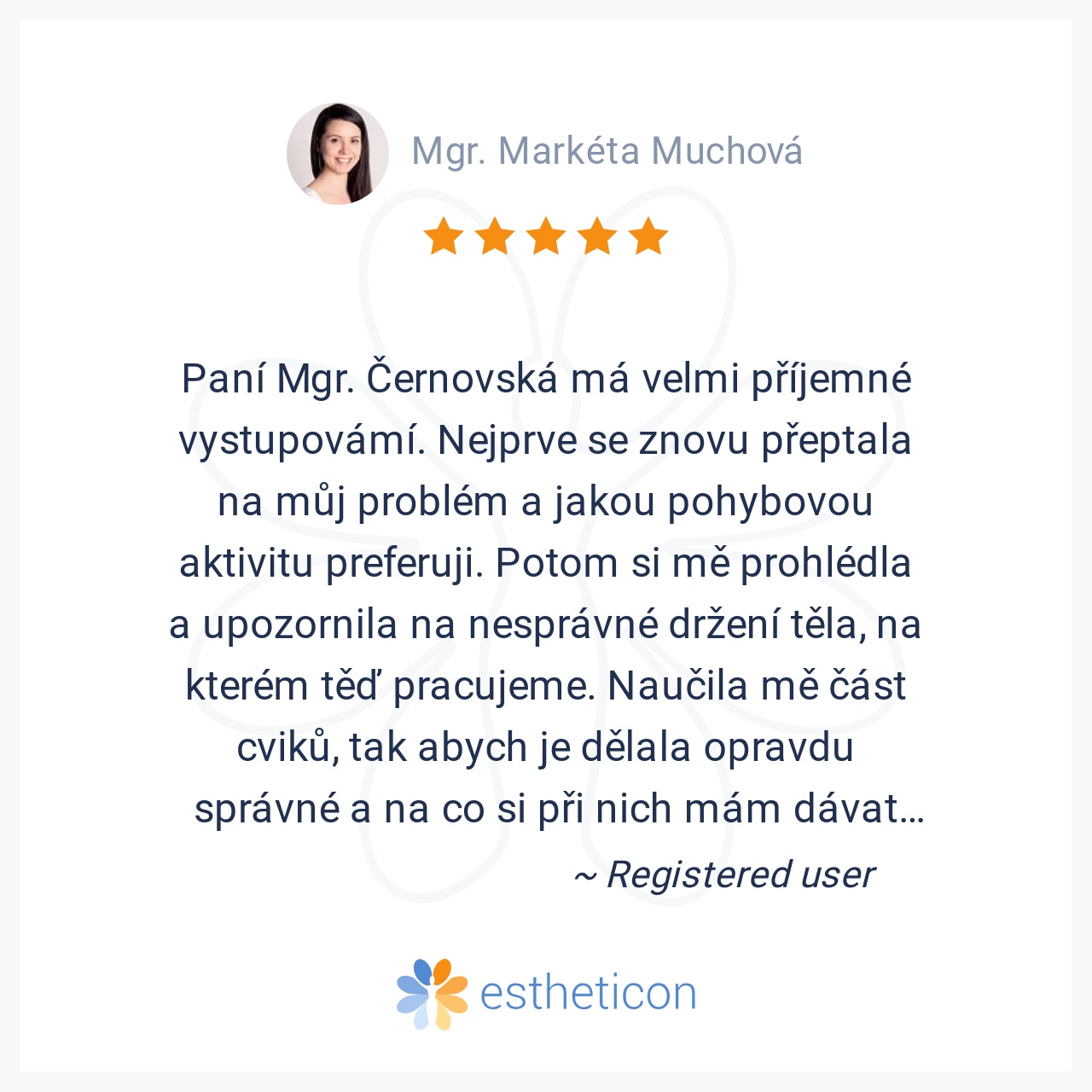 Paní Mgr. Černovská má velmi příjemné vystupovámí. Nejprve se znovu přeptala na můj problém a jakou pohybovou aktivitu preferuji. Potom si mě prohlédla a upozornila na nesprávné držení těla, na kterém těď pracujeme. Nauč... Více