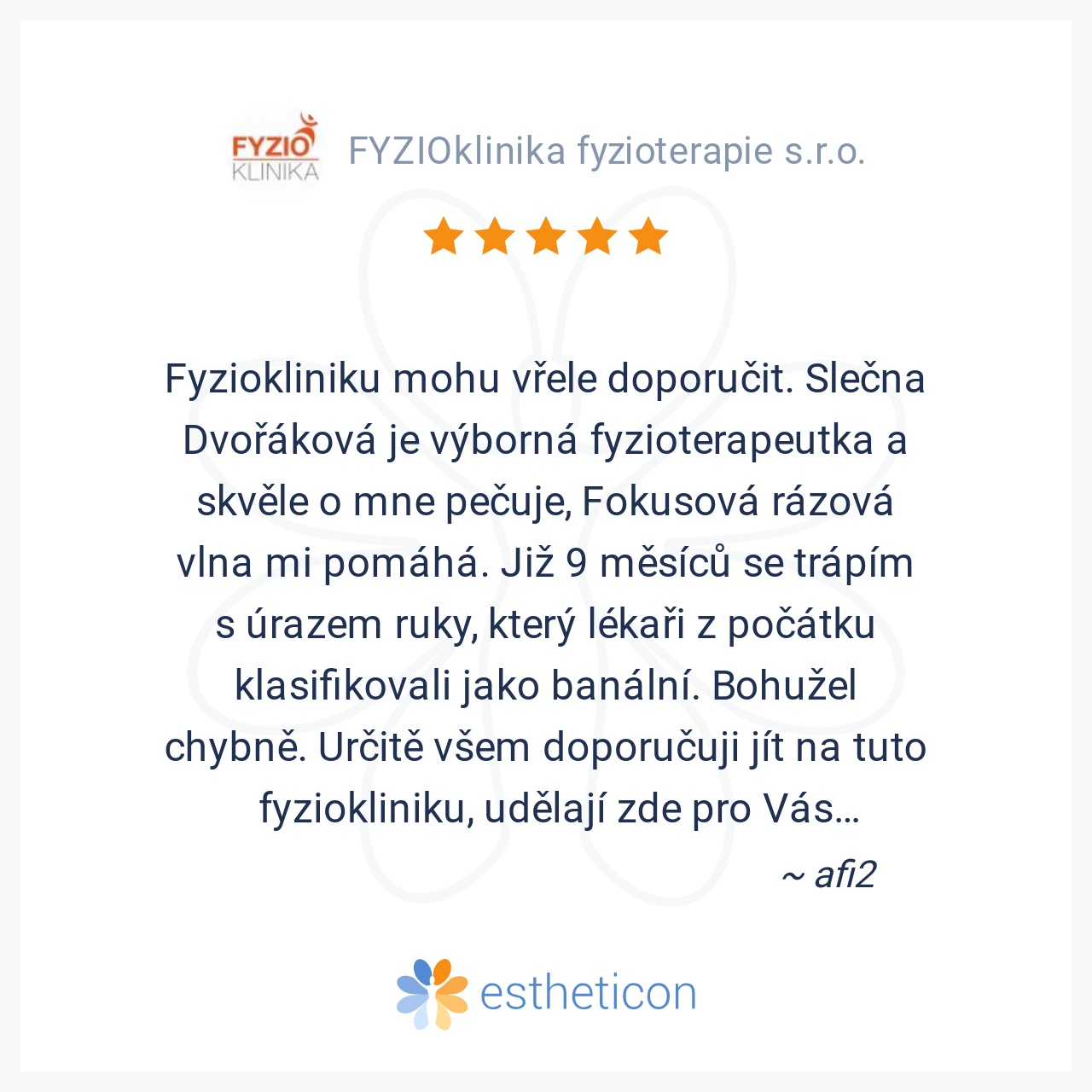 Fyziokliniku mohu vřele doporučit. Slečna Dvořáková je výborná fyzioterapeutka a skvěle o mne pečuje, Fokusová rázová vlna mi pomáhá. Již 9 měsíců se trápím s úrazem ruky, který lékaři z počátku klasifikovali jako banáln... Více