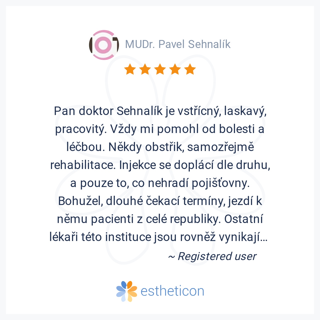 Pan doktor Sehnalík je vstřícný, laskavý, pracovitý. Vždy mi pomohl od bolesti a léčbou. Někdy obstřik, samozřejmě rehabilitace. Injekce se doplácí dle druhu, a pouze to, co nehradí pojišťovny. Bohužel, dlouhé čekací ter... Více