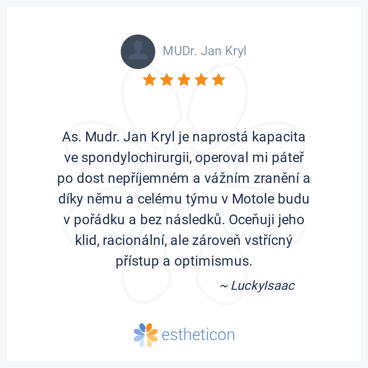 As. Mudr. Jan Kryl je naprostá kapacita ve spondylochirurgii, operoval mi páteř po dost nepříjemném a vážním zranění a díky němu a celému týmu v Motole budu v pořádku a bez následků. Oceňuji jeho klid, racionální, ale zá... Více