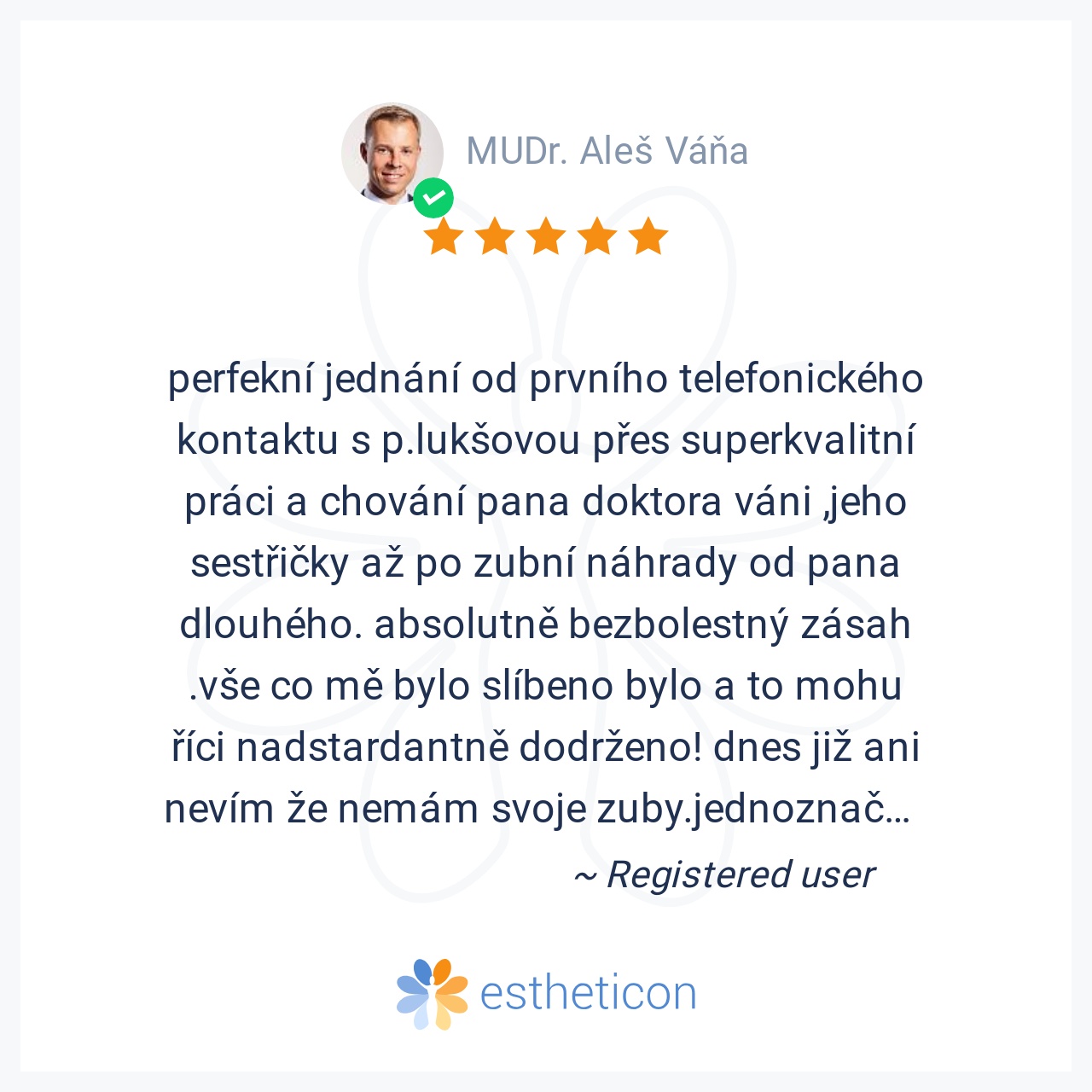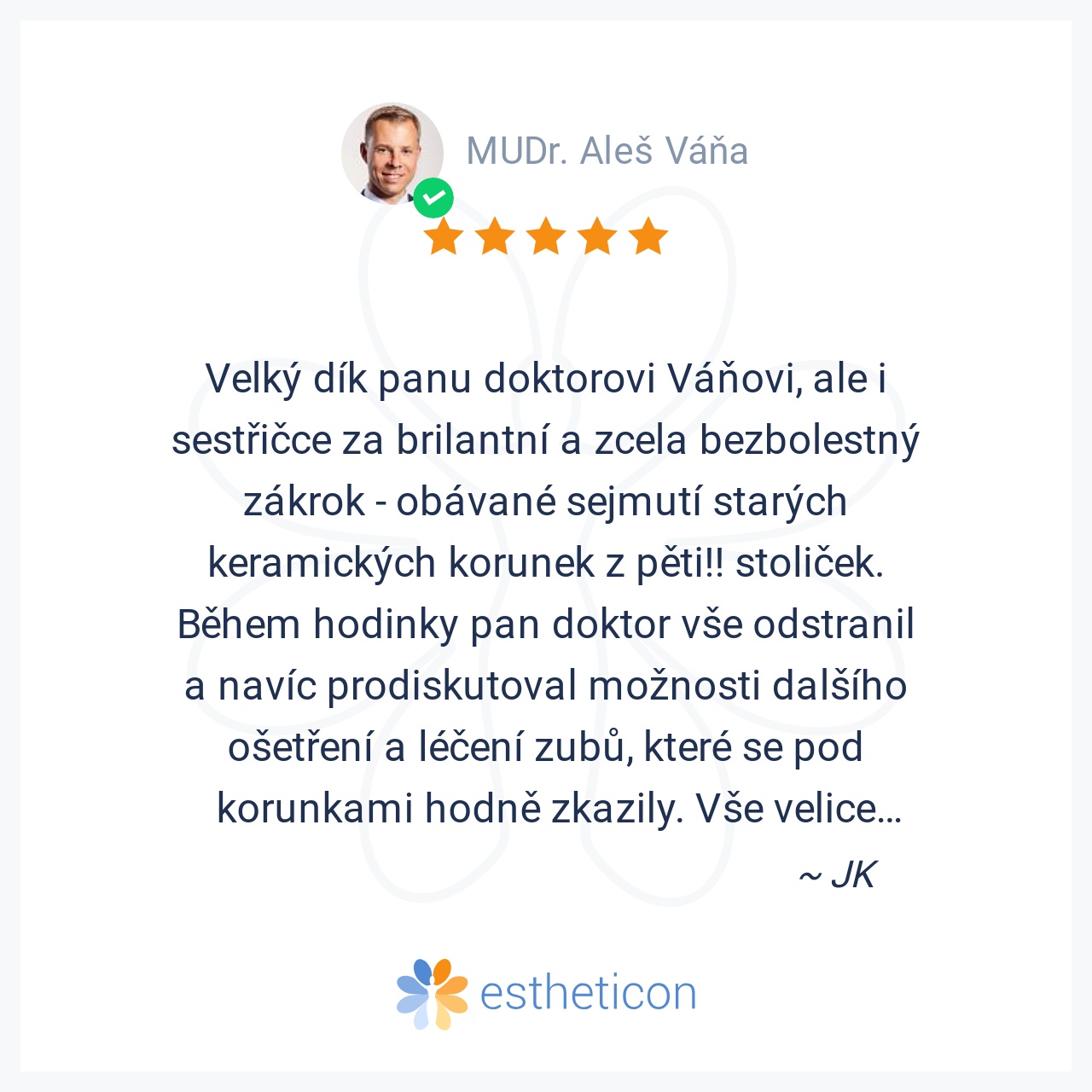 Velký dík panu doktorovi Váňovi, ale i sestřičce za brilantní a zcela bezbolestný zákrok - obávané sejmutí starých keramických korunek z pěti!! stoliček. Během hodinky pan doktor vše odstranil a navíc prodiskutoval možno... Více