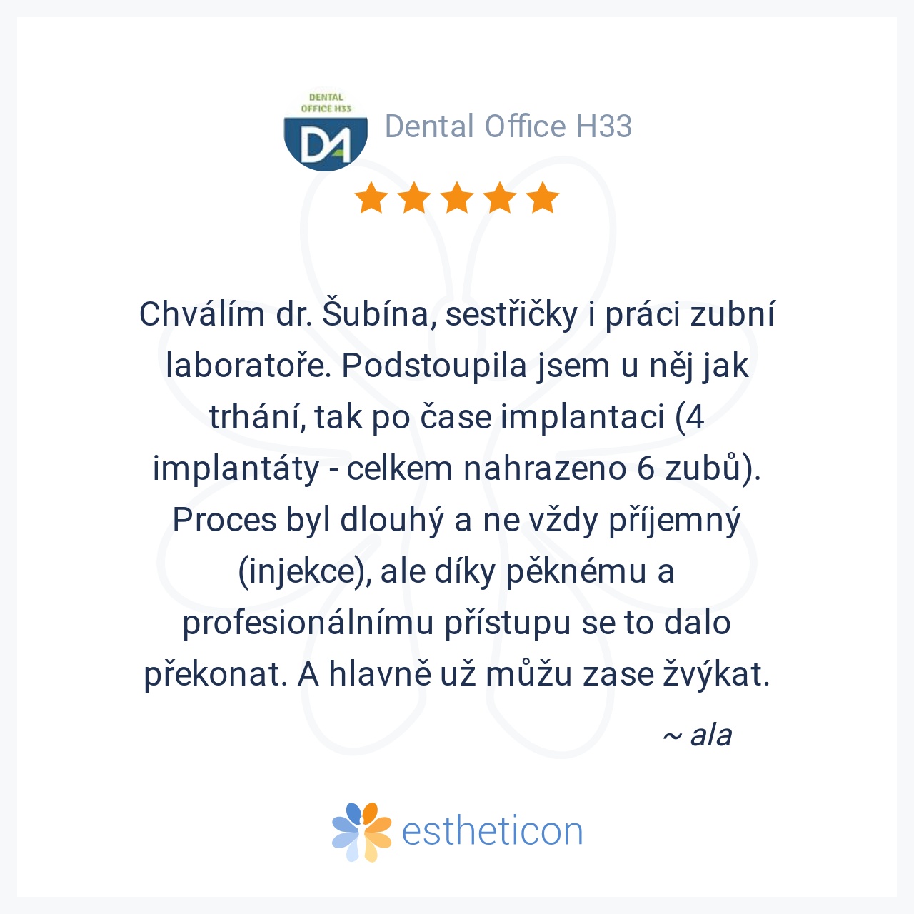Chválím dr. Šubína, sestřičky i práci zubní laboratoře. Podstoupila jsem u něj jak trhání, tak po čase implantaci (4 implantáty - celkem nahrazeno 6 zubů). Proces byl dlouhý a ne vždy příjemný (injekce), ale díky pěknému... Více