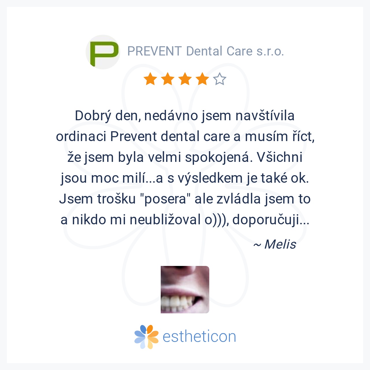 Dobrý den, nedávno jsem navštívila ordinaci Prevent dental care a musím říct, že jsem byla velmi spokojená. Všichni jsou moc milí...a s výsledkem je také ok. Jsem trošku "posera" ale zvládla jsem to a nikdo mi neubli... Více