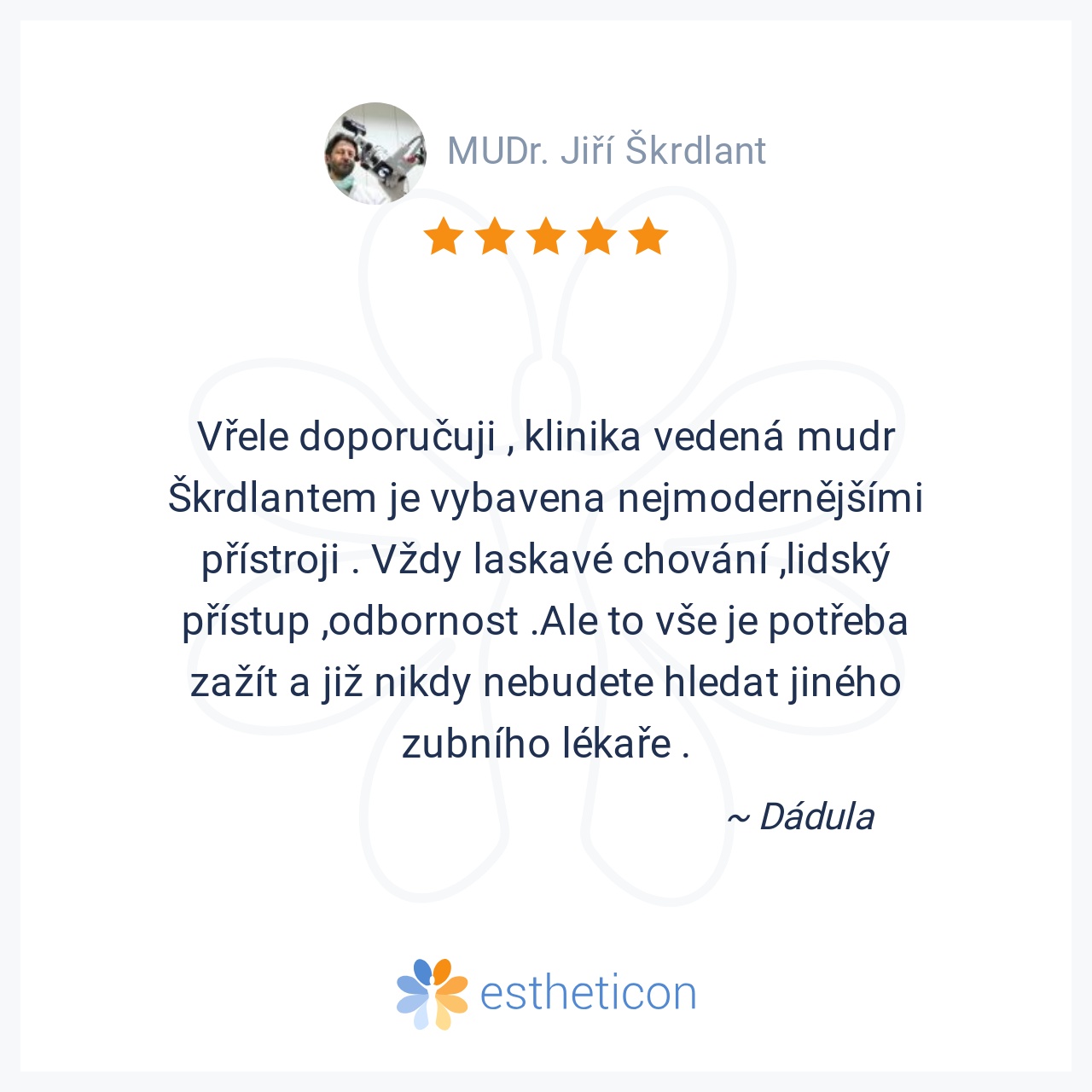 Vřele doporučuji , klinika vedená mudr Škrdlantem je vybavena nejmodernějšími přístroji . Vždy laskavé chování ,lidský přístup ,odbornost .Ale to vše je potřeba zažít a již nikdy nebudete hledat jiného zubního lékaře .