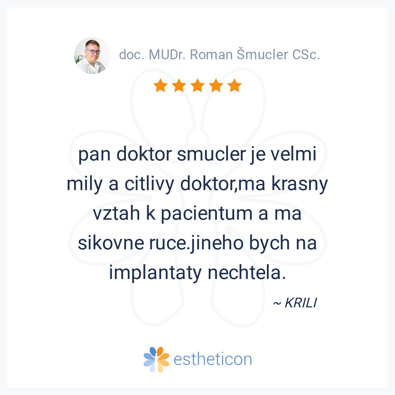 pan doktor smucler je velmi mily a citlivy doktor,ma krasny vztah k pacientum a ma sikovne ruce.jineho bych na implantaty nechtela.