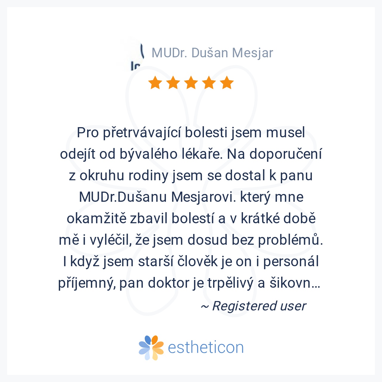 Pro přetrvávající bolesti jsem musel odejít od bývalého lékaře. Na doporučení z okruhu rodiny jsem se dostal k panu MUDr.Dušanu Mesjarovi. který mne okamžitě zbavil bolestí a v krátké době mě i vyléčil, že jsem dosud bez... Více