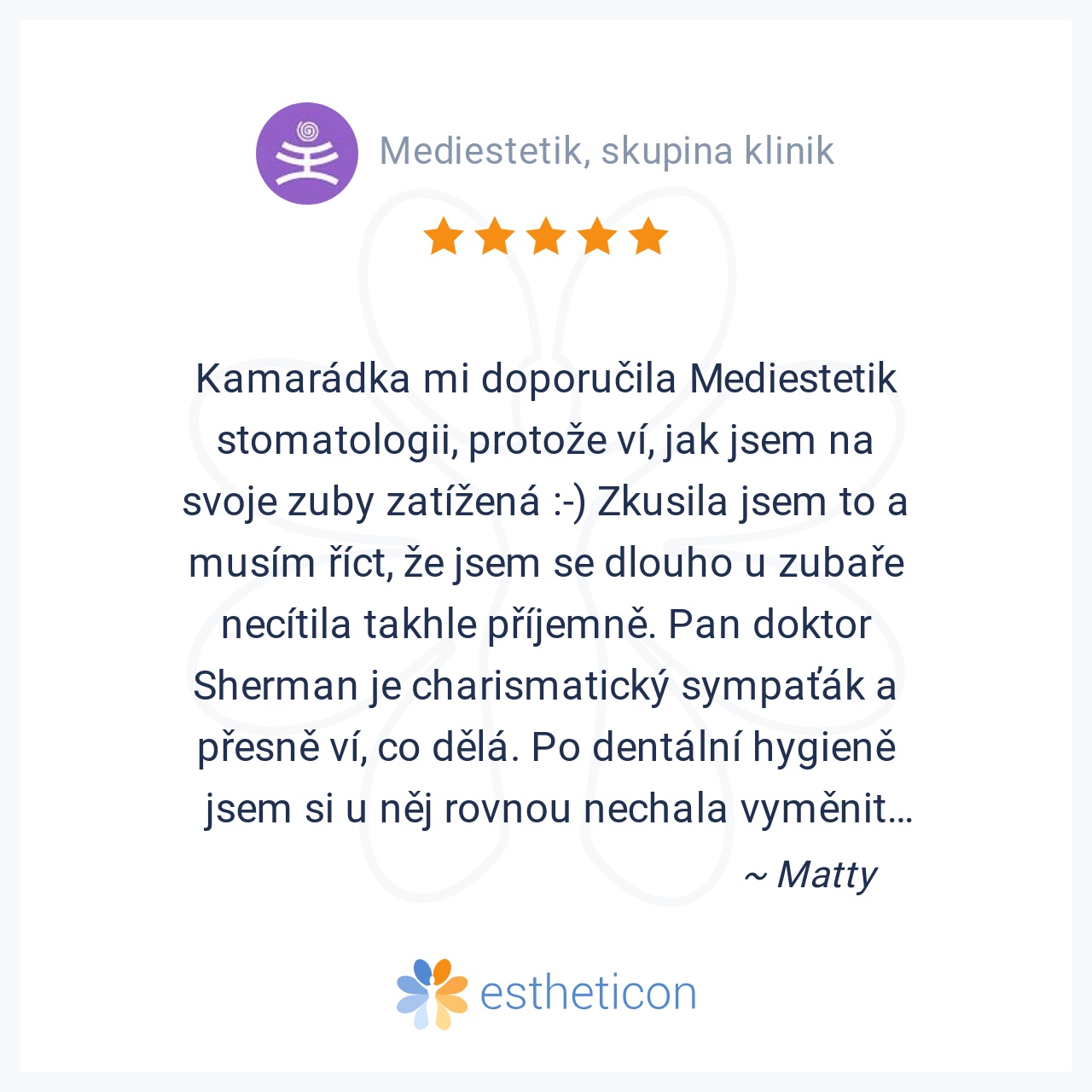 Kamarádka mi doporučila Mediestetik stomatologii, protože ví, jak jsem na svoje zuby zatížená :-) Zkusila jsem to a musím říct, že jsem se dlouho u zubaře necítila takhle příjemně. Pan doktor Sherman je charismatický sym... Více