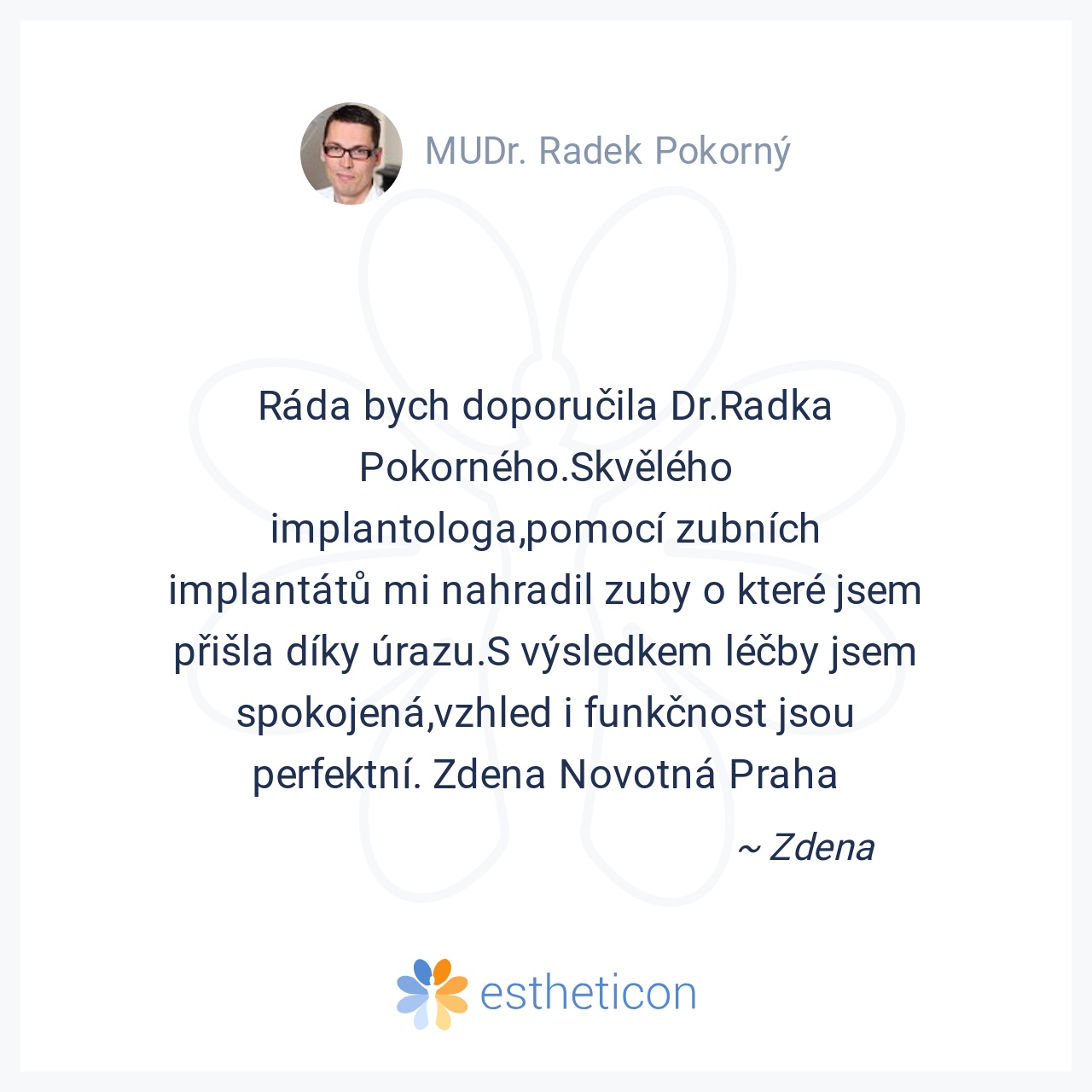 Ráda bych doporučila Dr.Radka Pokorného.Skvělého implantologa,pomocí zubních implantátů mi nahradil zuby o které jsem přišla díky úrazu.S výsledkem léčby jsem spokojená,vzhled i funkčnost jsou perfektní. Zdena Novotná Pr... Více