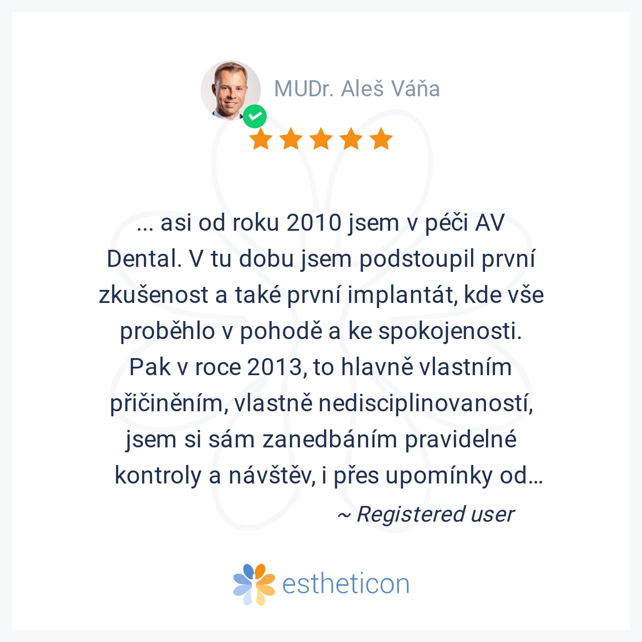 ... asi od roku 2010 jsem v péči AV Dental. V tu dobu jsem podstoupil první zkušenost a také první implantát, kde vše proběhlo v pohodě a ke spokojenosti. Pak v roce 2013, to hlavně vlastním přičiněním, vlastně nediscipl... Více