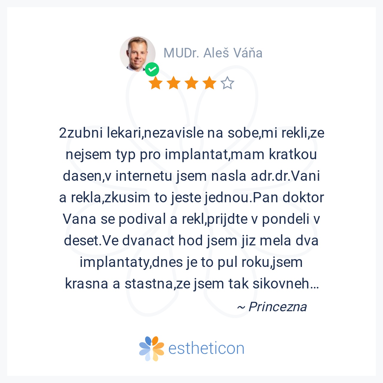 2zubni lekari,nezavisle na sobe,mi rekli,ze nejsem typ pro implantat,mam kratkou dasen,v internetu jsem nasla adr.dr.Vani a rekla,zkusim to jeste jednou.Pan doktor Vana se podival a rekl,prijdte v pondeli v deset.Ve dvan... Více