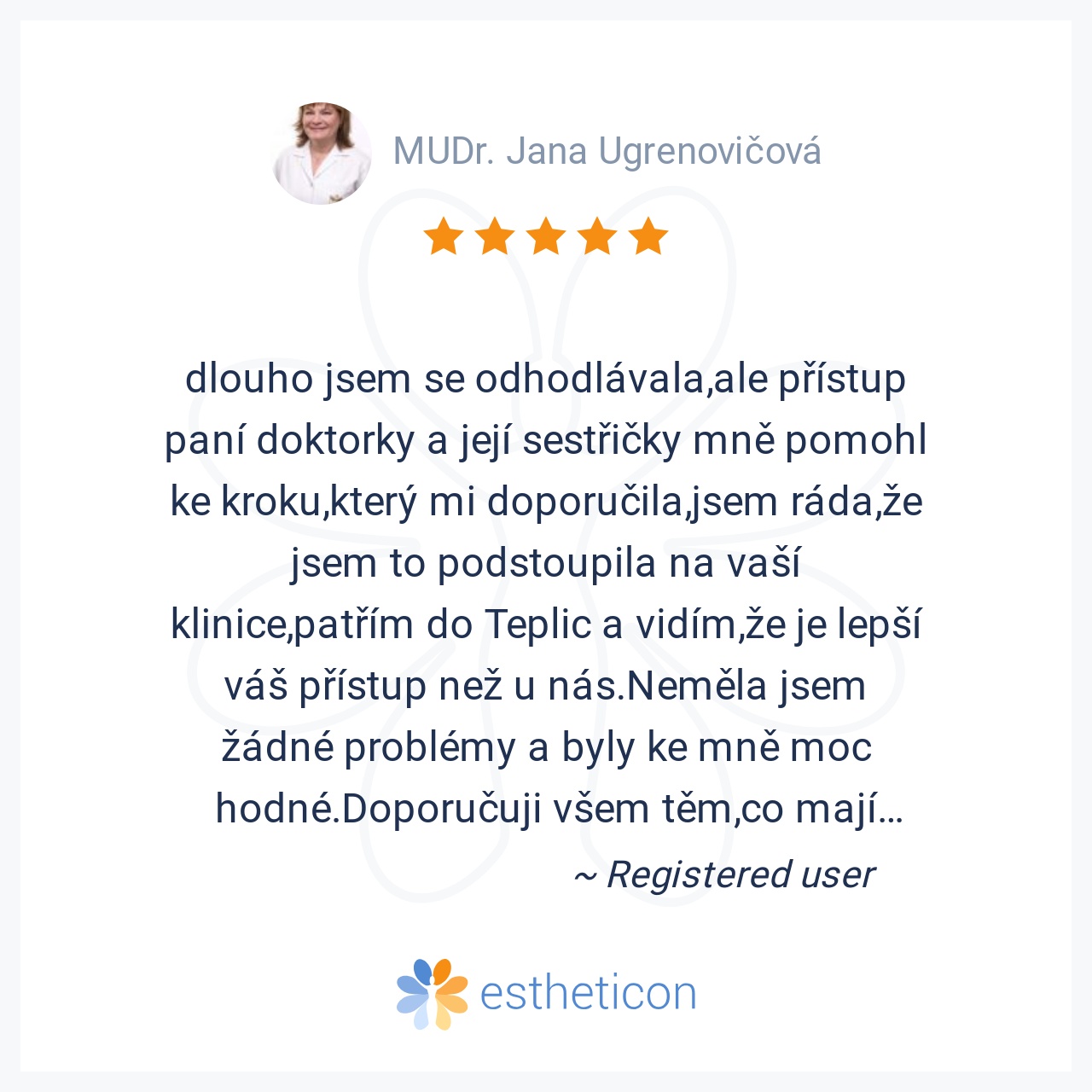 dlouho jsem se odhodlávala,ale přístup paní doktorky Ungrenovičové a její sestřičky mně pomohl ke kroku,který mi doporučila,jsem ráda,že jsem to podstoupila na vaší klinice,patřím do Teplic a vidím,že je lepší váš přístu... Více