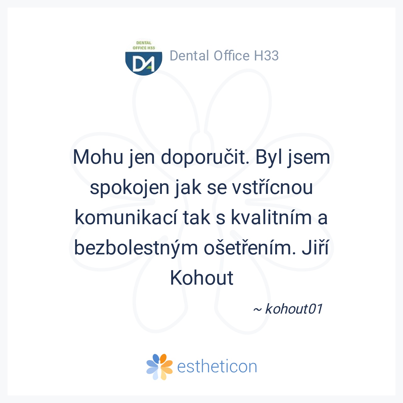 Mohu jen doporučit. Byl jsem spokojen jak se vstřícnou komunikací tak s kvalitním a bezbolestným ošetřením. Jiří Kohout
