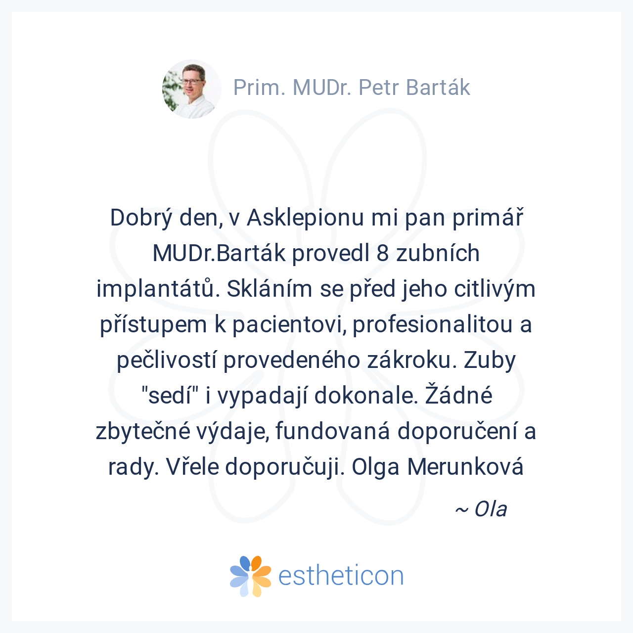 Dobrý den, v Asklepionu mi pan primář MUDr.Barták provedl 8 zubních implantátů. Skláním se před jeho citlivým přístupem k pacientovi, profesionalitou a pečlivostí provedeného zákroku. Zuby "sedí" i vypadají dokonale. ... Více
