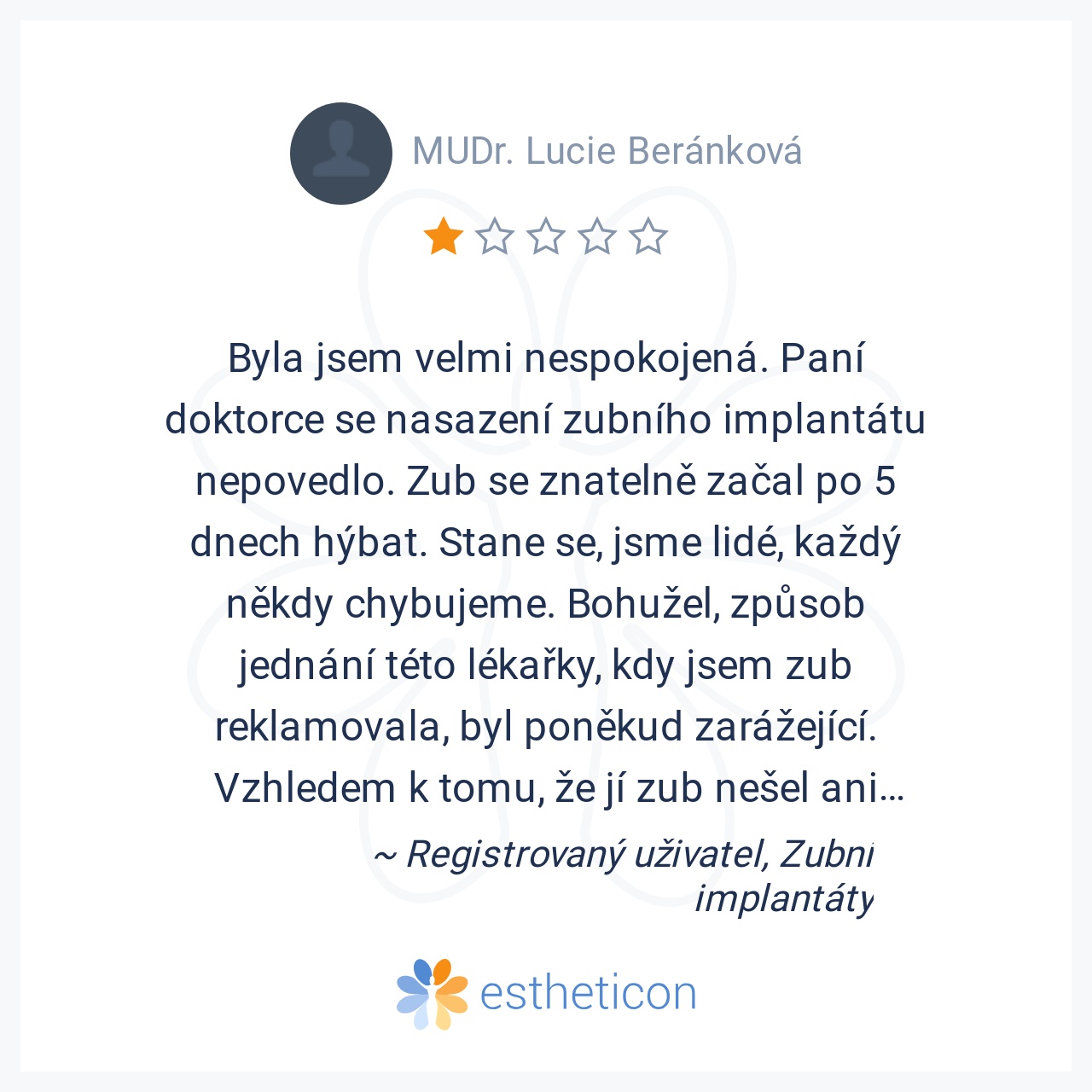 Byla jsem velmi nespokojená. Paní doktorce se nasazení zubního implantátu nepovedlo. Zub se znatelně začal po 5 dnech hýbat. Stane se, jsme lidé, každý někdy chybujeme. Bohužel, způsob jednání této lékařky, kdy jsem zub ... Více