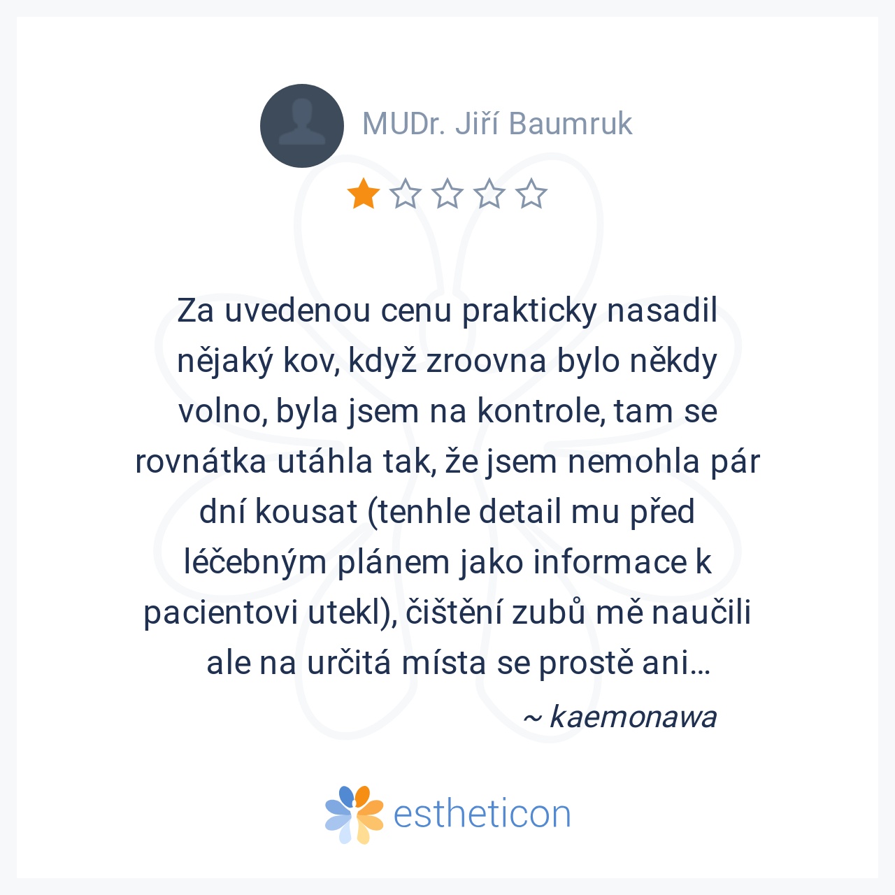 Absolvoval jsem asi 15-20 zakroku, vcetne montaze implantatu, po roce je vse OK, nikdy me nic nebolelo a ziskal jsem znovu duveru k zubnim lekarum.