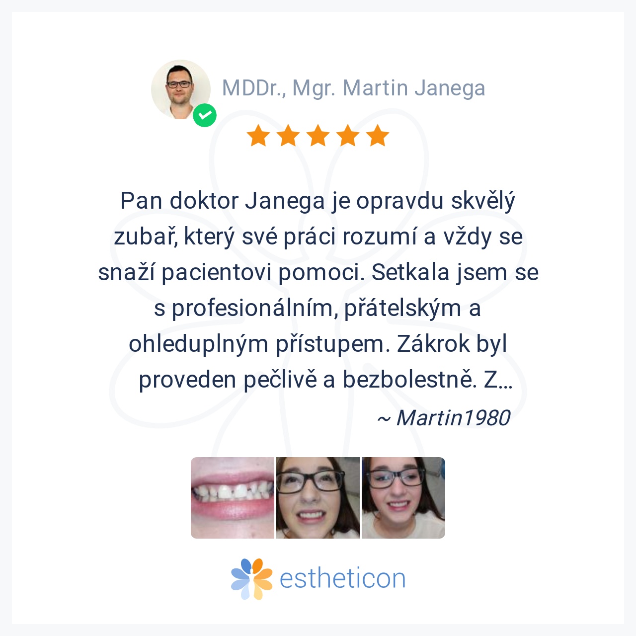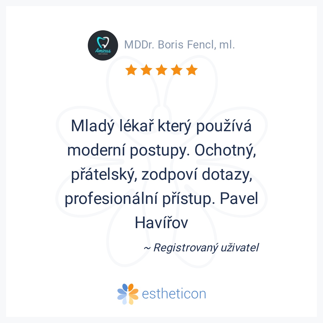 Nejlepší pan doktor,pečlivě odvedena práce,vše bezbolestné.Prostě supééér..pane doktore moc Vám děkuji za Vaši péči,díky které se můžu opět usmívat.A nebylo toho málo,co pan doktor zachrańoval.Děkuji,Pavla L.