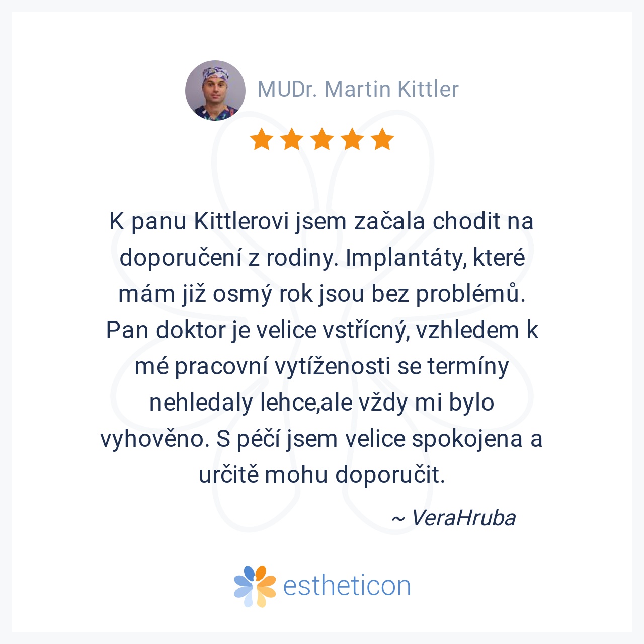 K panu Kittlerovi jsem začala chodit na doporučení z rodiny. Implantáty, které mám již osmý rok jsou bez problémů. Pan doktor je velice vstřícný, vzhledem k mé pracovní vytíženosti se termíny nehledaly lehce,ale vždy mi ... Více