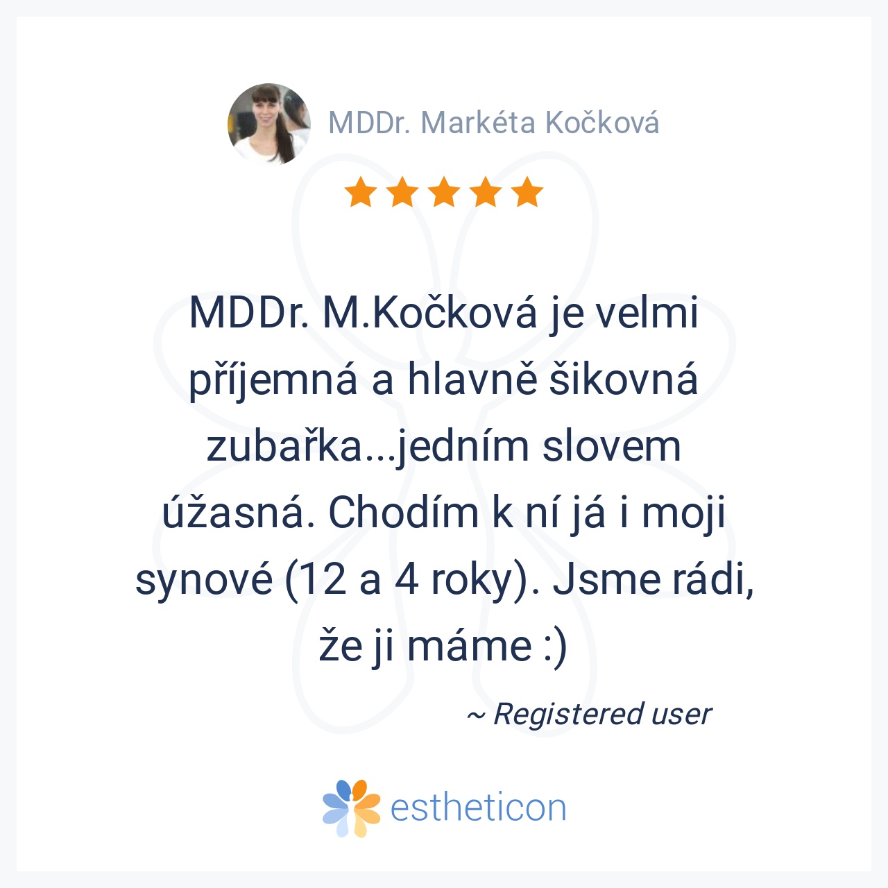 MDDr. M.Kočková je velmi příjemná a hlavně šikovná zubařka...jedním slovem úžasná. Chodím k ní já i moji synové (12 a 4 roky). Jsme rádi, že ji máme :)