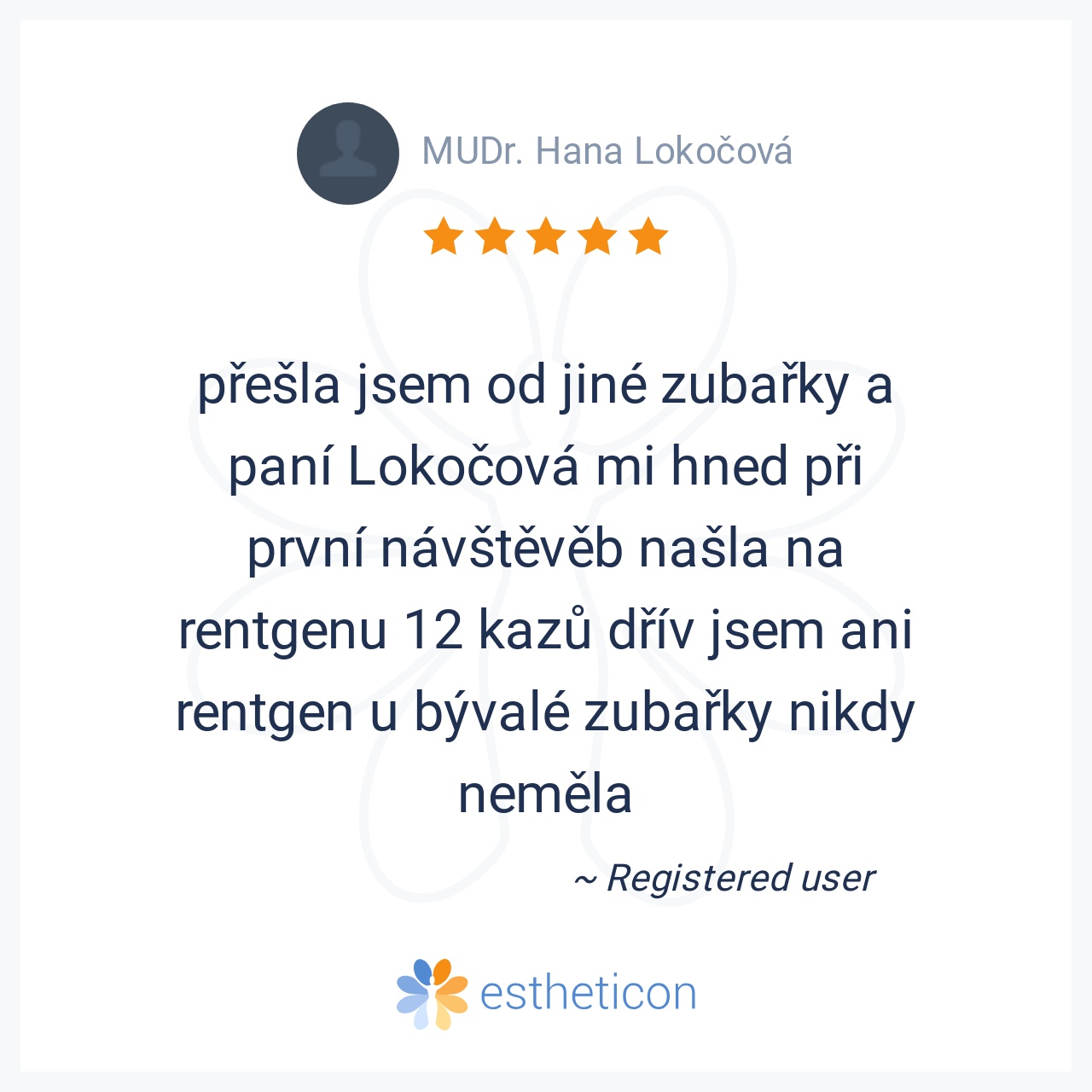 přešla jsem od jiné zubařky a paní Lokočová mi hned při první návštěvěb našla na rentgenu 12 kazů dřív jsem ani rentgen u bývalé zubařky nikdy neměla