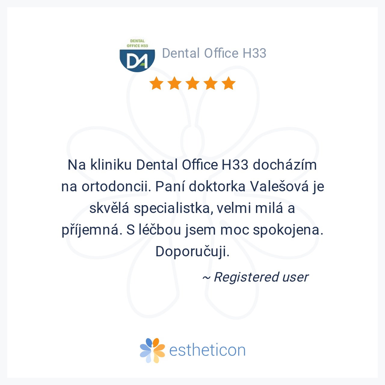 Na kliniku Dental Office H33 docházím na ortodoncii. Paní doktorka Valešová je skvělá specialistka, velmi milá a příjemná. S léčbou jsem moc spokojena. Doporučuji.
