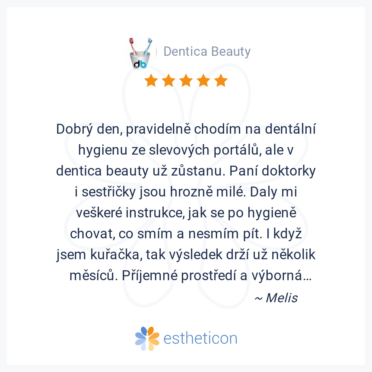 Dobrý den, pravidelně chodím na dentální hygienu ze slevových portálů, ale v dentica beauty už zůstanu. Paní doktorky i sestřičky jsou hrozně milé. Daly mi veškeré instrukce, jak se po hygieně chovat, co smím a nesmím pí... Více