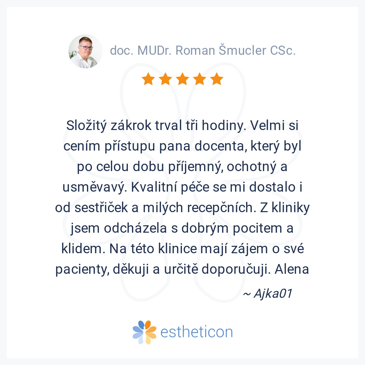 Pan doktor je nejen profesionál ve svém oboru, ale i jeho chování v dobrém vybočuje z řady ostatních lékařů. Přeji mu, aby mu vydržel úsměv a chuť do práce i do života. Jeho rodiče na něho mohou být jen pyšní. S poděková... Více