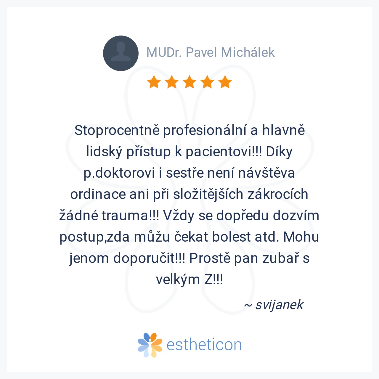 Nejlepší pan doktor,pečlivě odvedena práce,vše bezbolestné.Prostě supééér..pane doktore moc Vám děkuji za Vaši péči,díky které se můžu opět usmívat.A nebylo toho málo,co pan doktor zachrańoval.Děkuji,Pavla L.