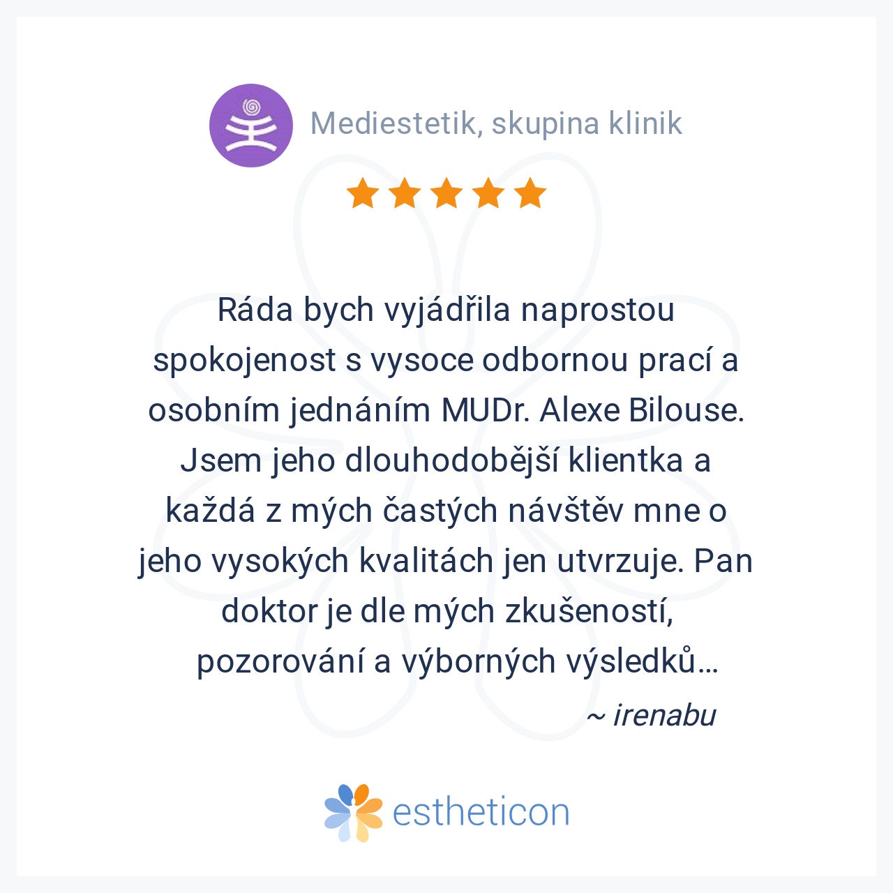 Ráda bych vyjádřila naprostou spokojenost s vysoce odbornou prací a osobním jednáním MUDr. Alexe Bilouse. Jsem jeho dlouhodobější klientka a každá z mých častých návštěv mne o jeho vysokých kvalitách jen utvrzuje. Pan do... Více