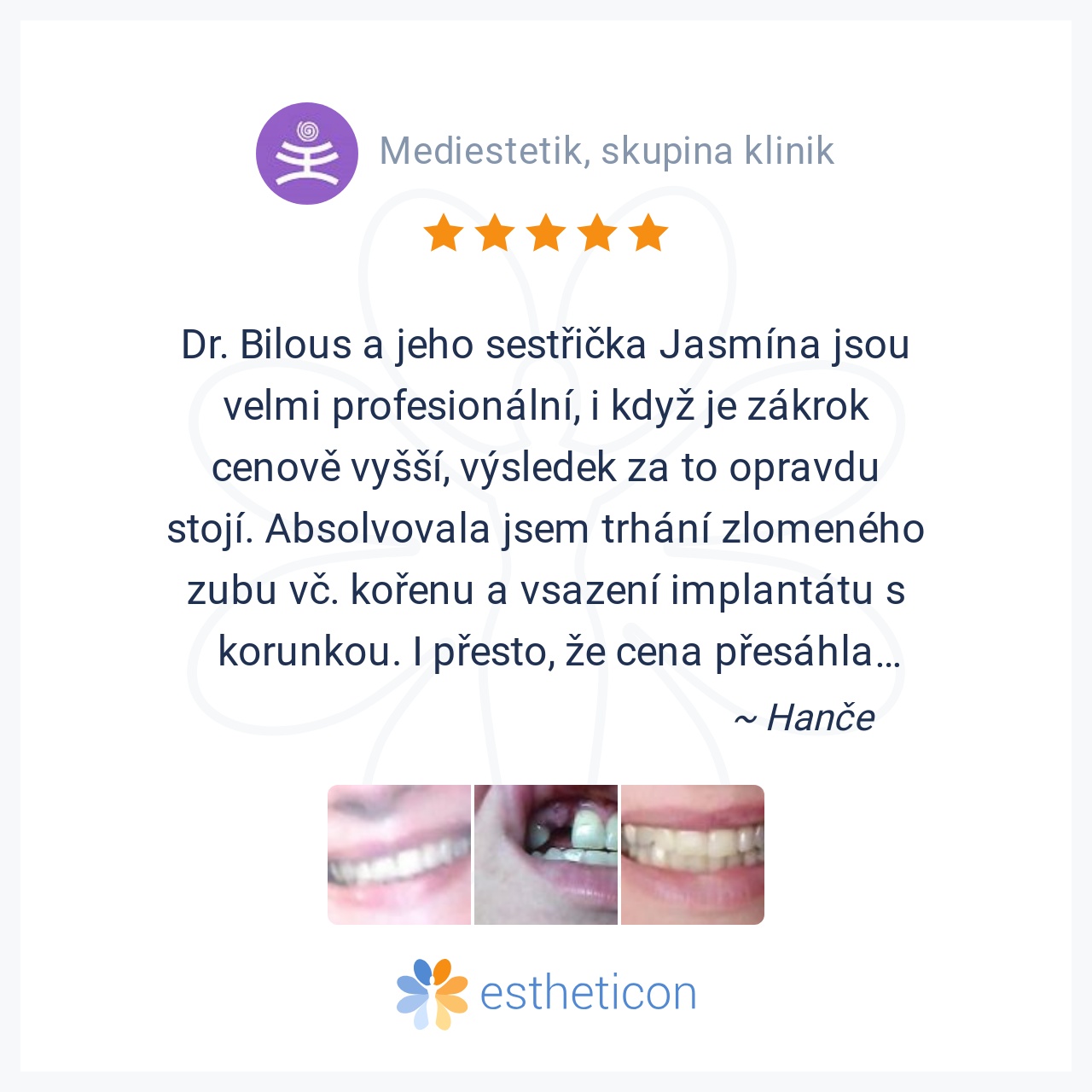 Dr. Bilous a jeho sestřička Jasmína jsou velmi profesionální, i když je zákrok cenově vyšší, výsledek za to opravdu stojí. Absolvovala jsem trhání zlomeného zubu vč. kořenu a vsazení implantátu s korunkou. I přesto, že c... Více
