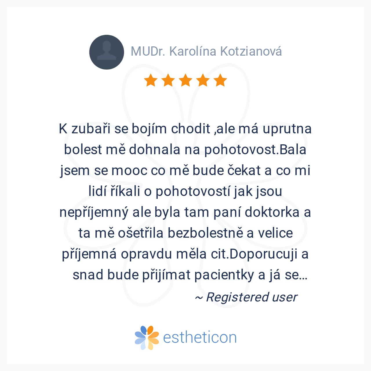 Velice hodna pani doktorka , opravovala mi dva zlomene zuby a byla citliva a pecliva . Pro me navsteva zubare predstavuje nocni mury. U ni to vsak nebolelo . Rada se k ni vratim pokud ji jeste nekde v Praze najdu . Bohuz... Více