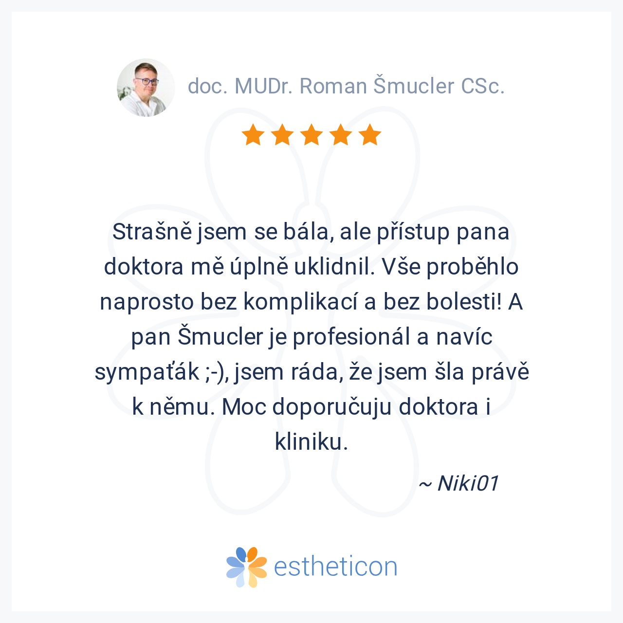Strašně jsem se bála, ale přístup pana doktora mě úplně uklidnil. Vše proběhlo naprosto bez komplikací a bez bolesti! A pan Šmucler je profesionál a navíc sympaťák ;-), jsem ráda, že jsem šla právě k němu. Moc doporučuju... Více
