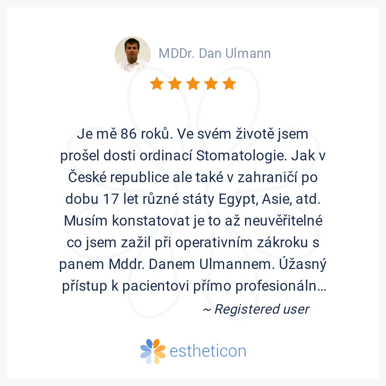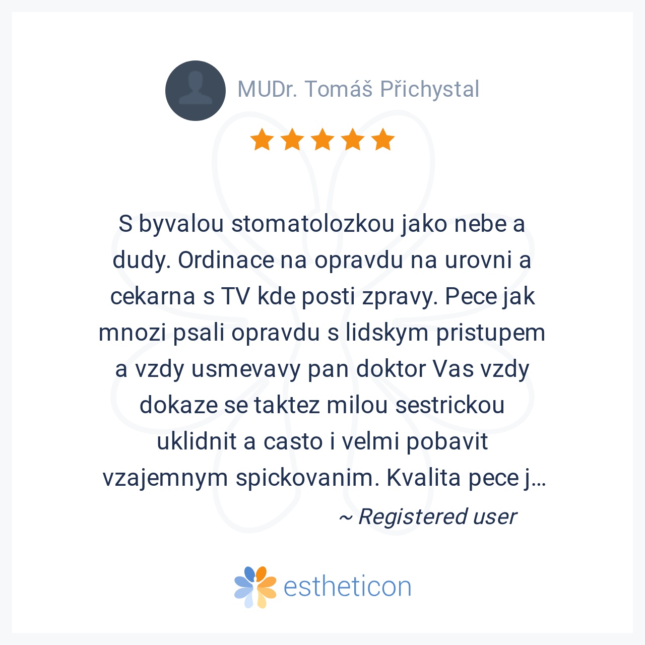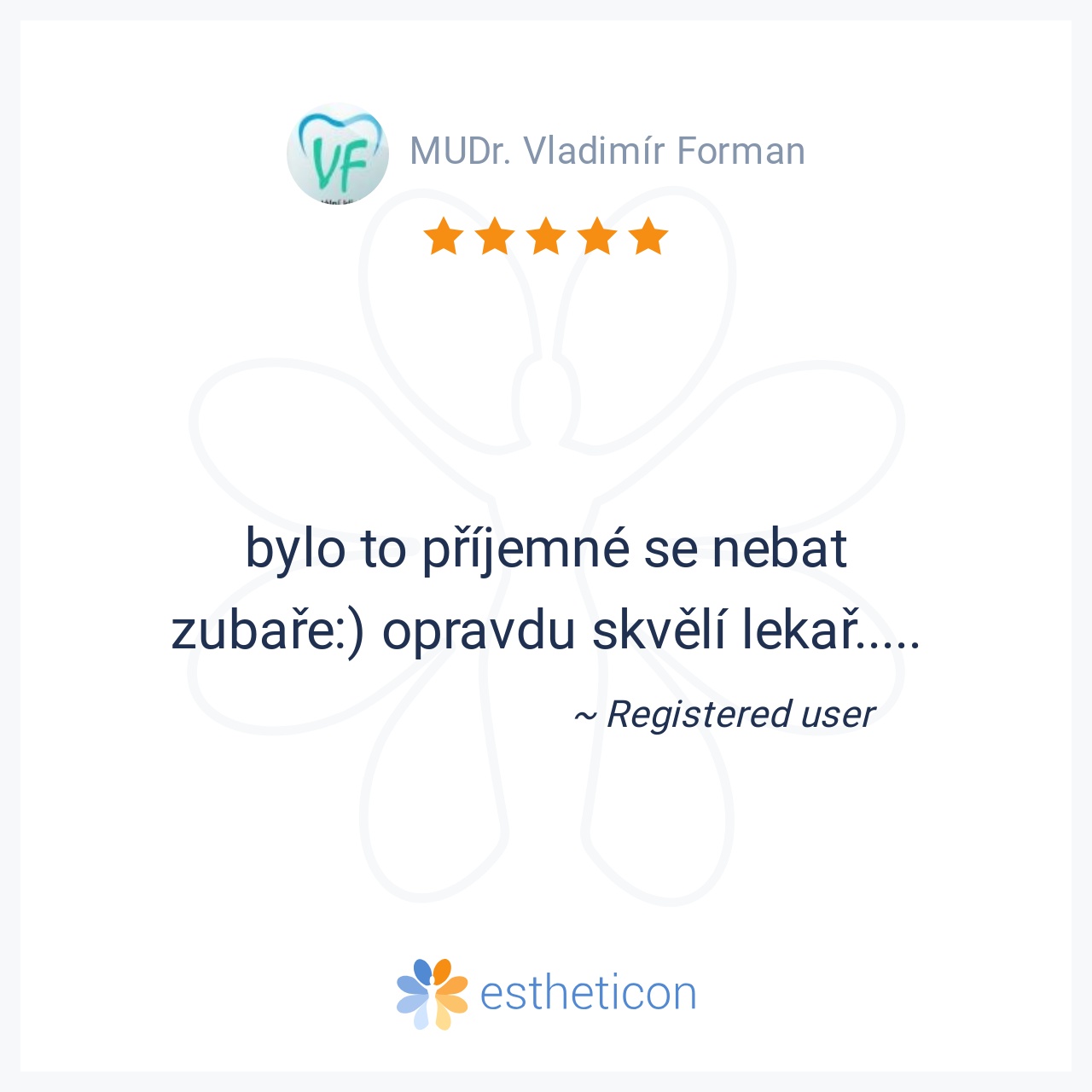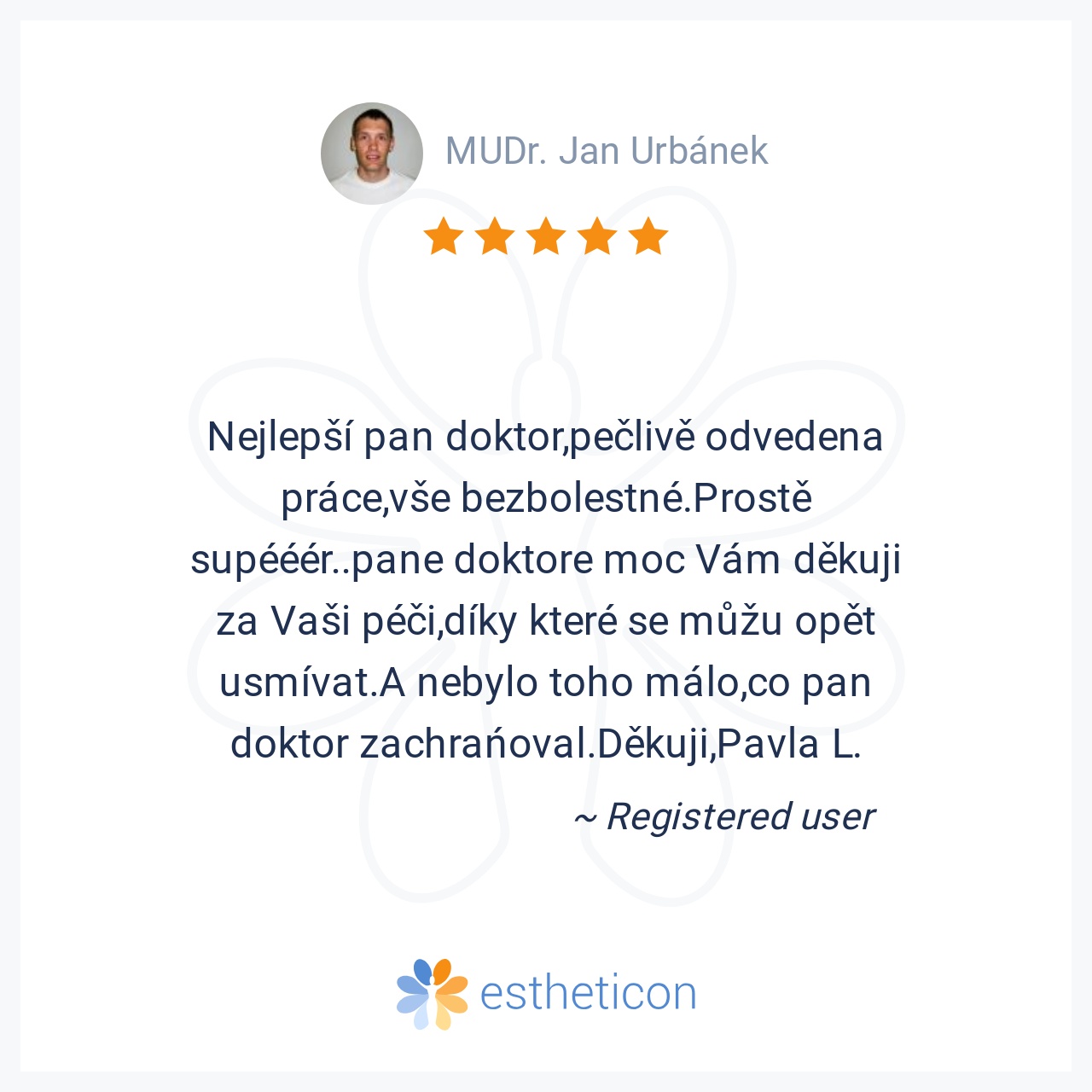 Nejlepší pan doktor,pečlivě odvedena práce,vše bezbolestné.Prostě supééér..pane doktore moc Vám děkuji za Vaši péči,díky které se můžu opět usmívat.A nebylo toho málo,co pan doktor zachrańoval.Děkuji,Pavla L.