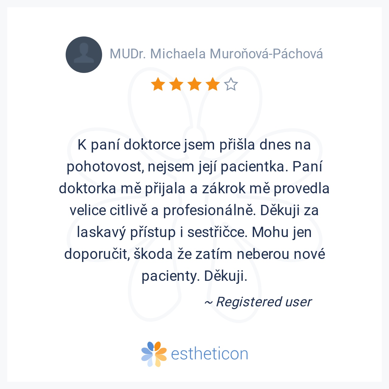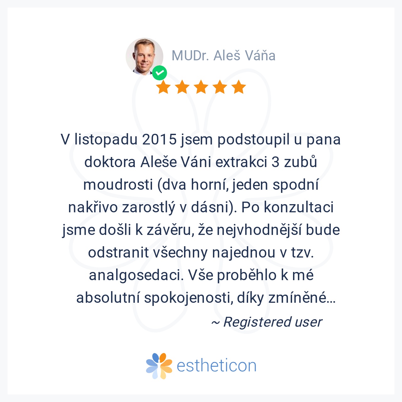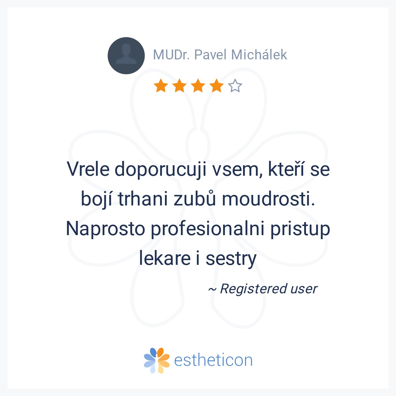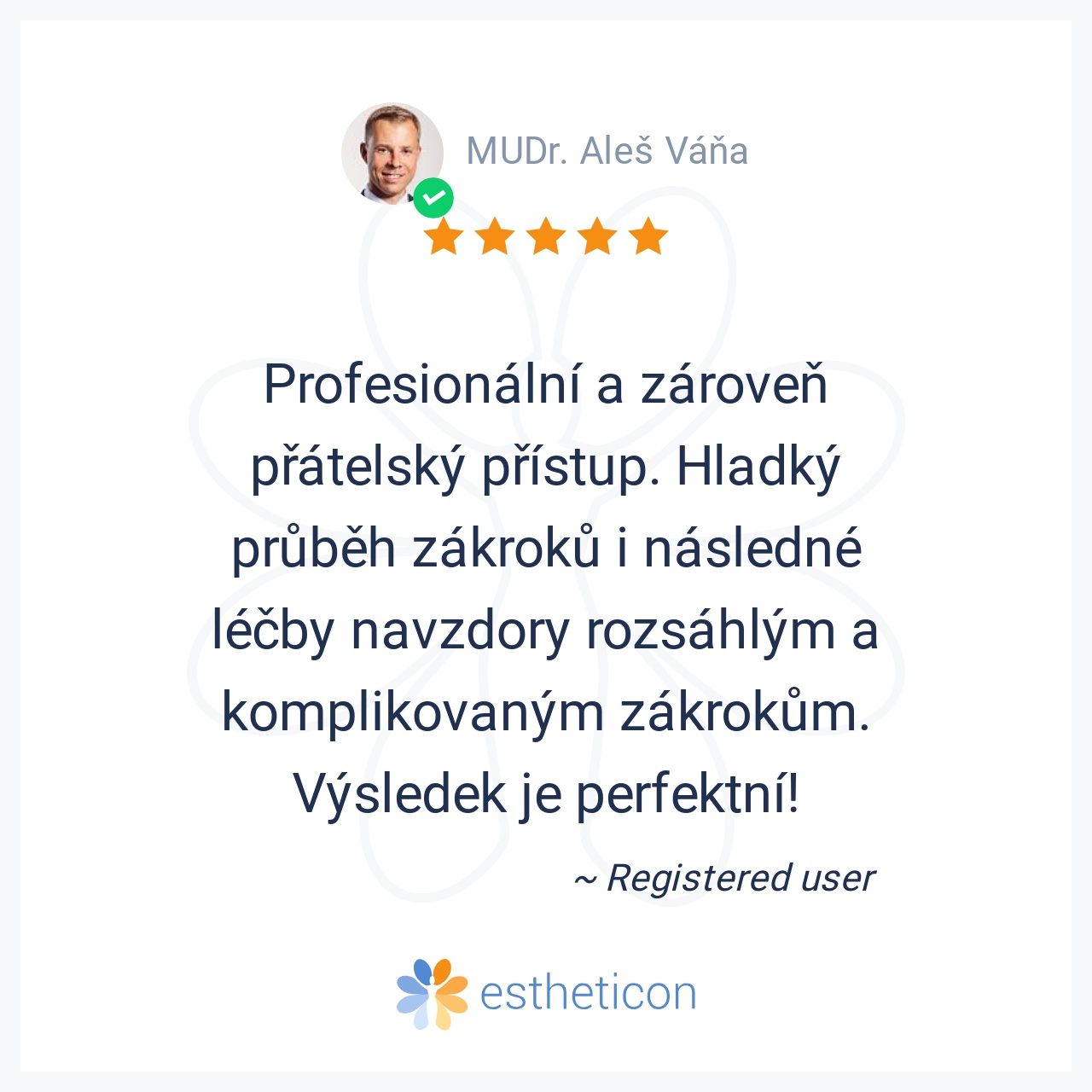 Nejlepší pan doktor,pečlivě odvedena práce,vše bezbolestné.Prostě supééér..pane doktore moc Vám děkuji za Vaši péči,díky které se můžu opět usmívat.A nebylo toho málo,co pan doktor zachrańoval.Děkuji,Pavla L.
