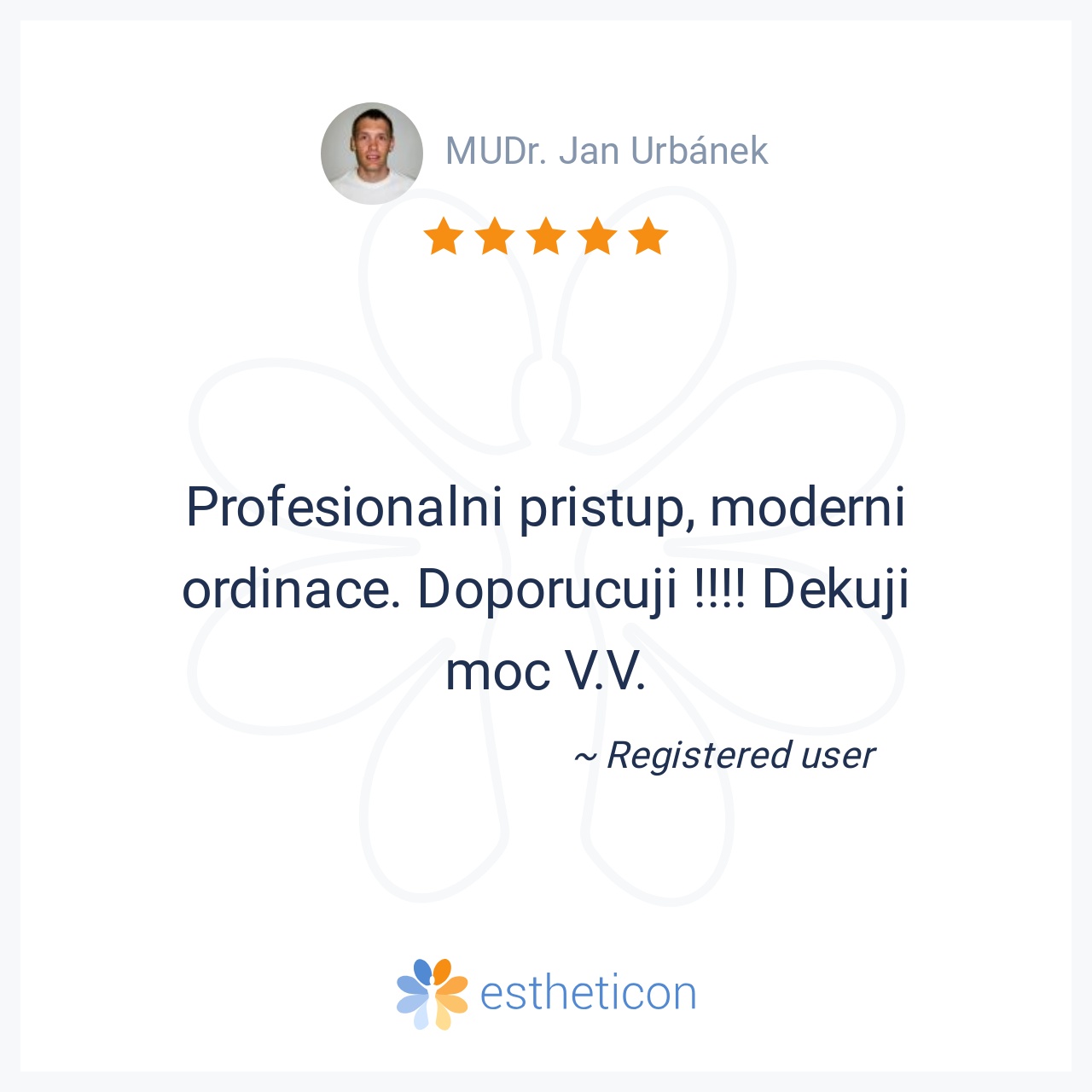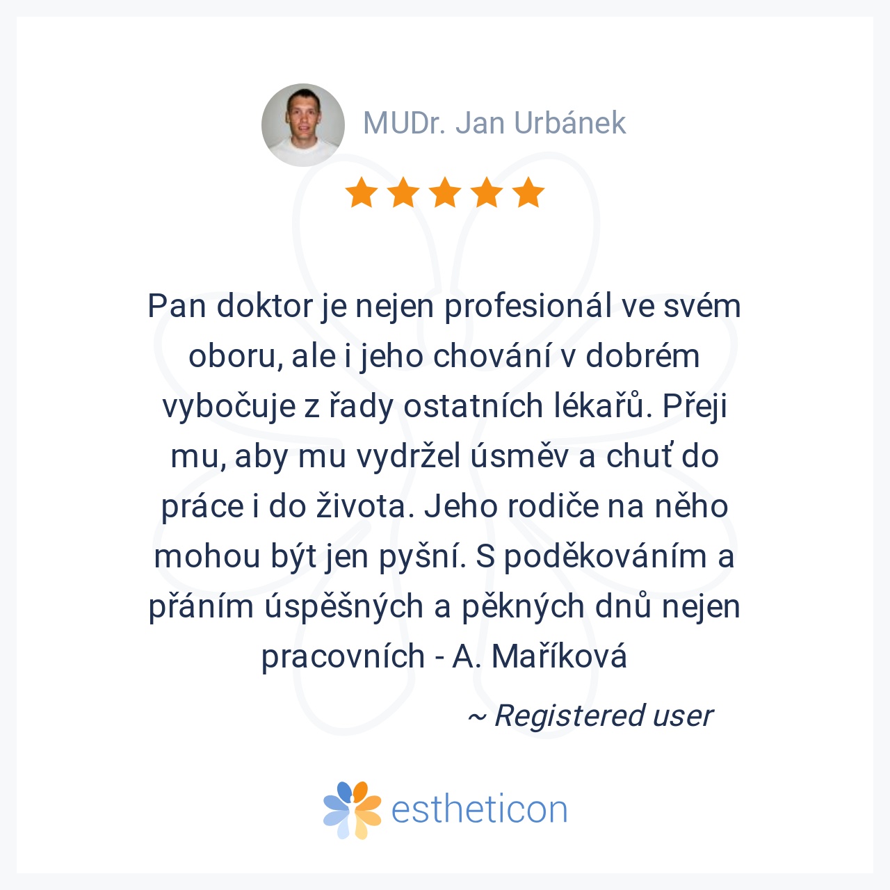 Pan doktor je nejen profesionál ve svém oboru, ale i jeho chování v dobrém vybočuje z řady ostatních lékařů. Přeji mu, aby mu vydržel úsměv a chuť do práce i do života. Jeho rodiče na něho mohou být jen pyšní. S poděková... Více