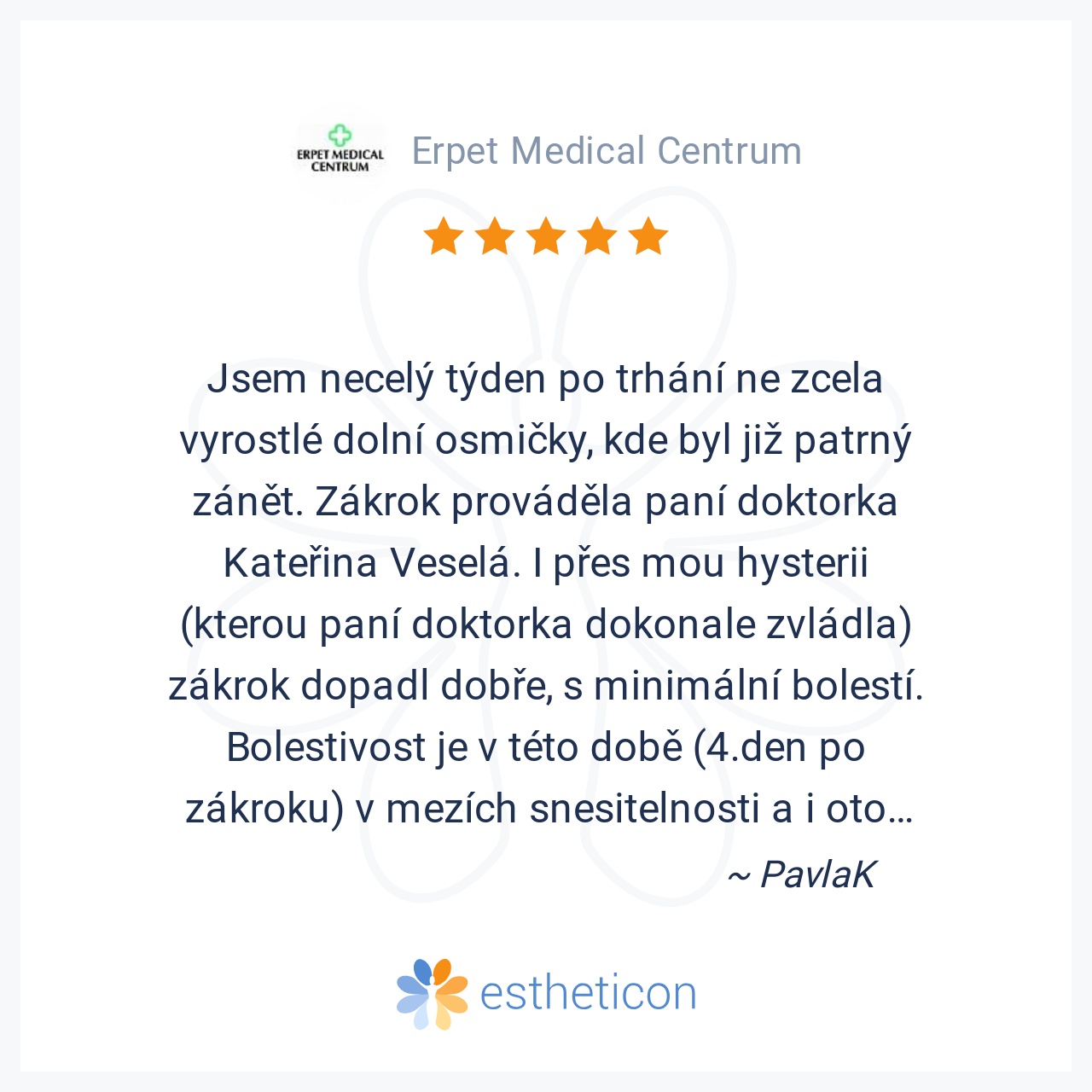 S operací, kterou jsem podstoupila v AV Dental jsem maximálně spokojená! :) Přestože jsem strašpytel a je pro mě problém jít i na odběry krve, z vyndání osmiček si neodnáším žádný traumatický zážitek ani se mi nevybavuje... Více