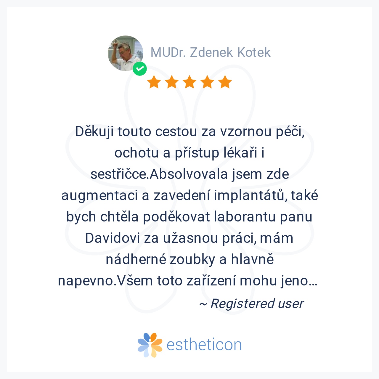 Byla jsem v péči pana doktora v PCDI a veškeré zákroky mě předem vysvětlil, včetně cenové kalkulace.Také dbal na bezbolestné provedení zákroků. Jsem spokojená a jen lituji, že přesídlil do Českých Budějovic.