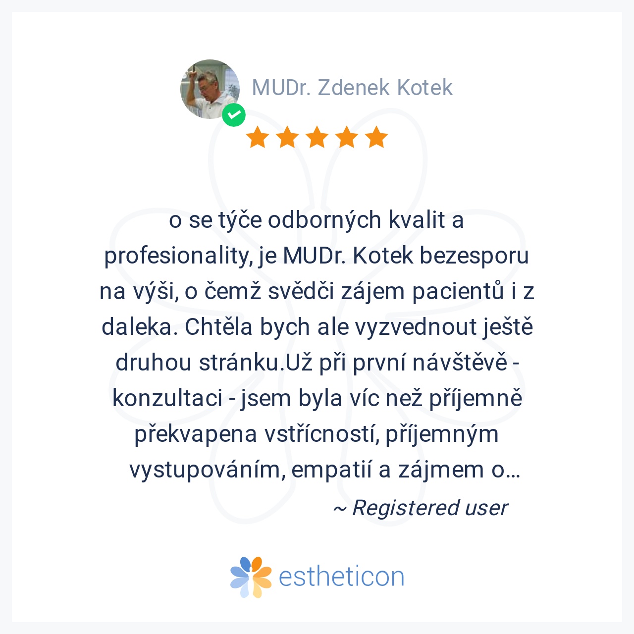 o se týče odborných kvalit a profesionality, je MUDr. Kotek bezesporu na výši, o čemž svědči zájem pacientů i z daleka. Chtěla bych ale vyzvednout ještě druhou stránku.Už při první návštěvě - konzultaci - jsem byla víc n... Více